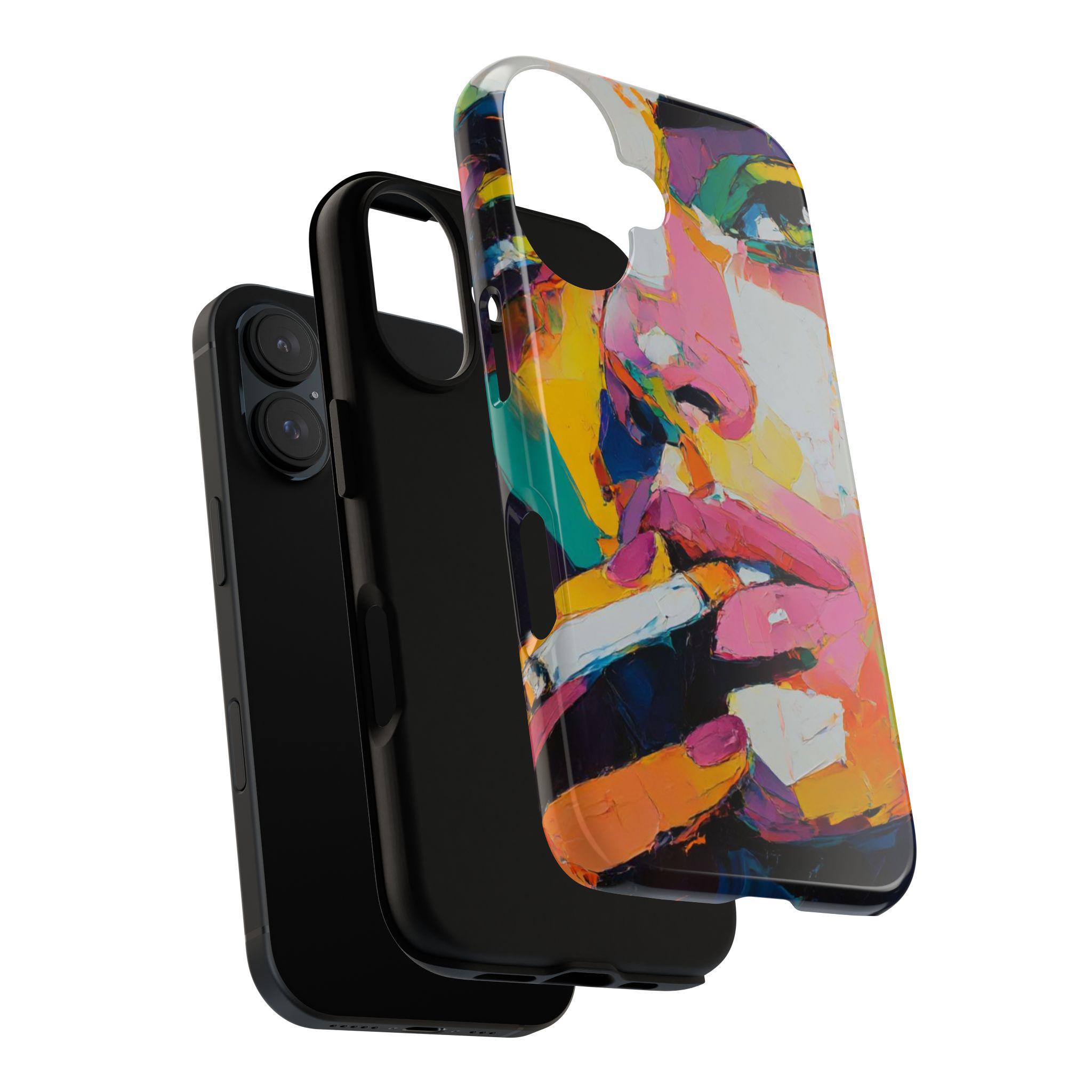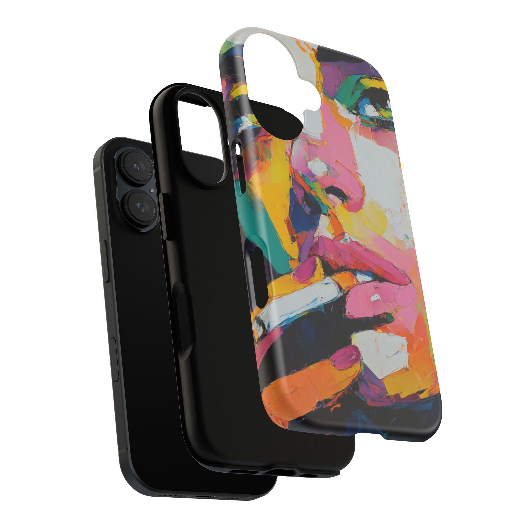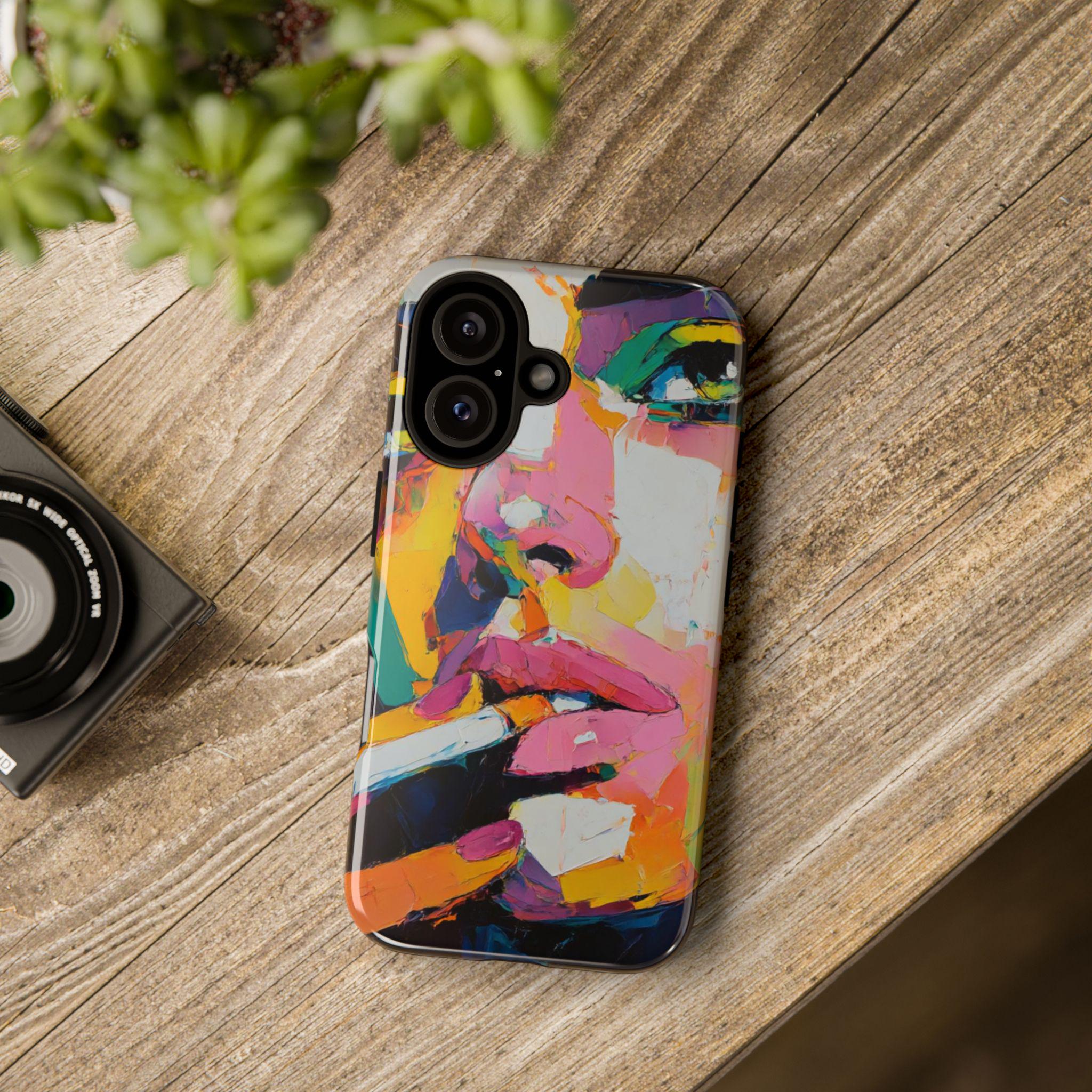 This tough phone case brings bold, expressive art to the everyday. The vibrant, painterly portrait wraps fully around the dual-layer shell, so every edge and corner becomes part of the composition. A glossy or matte finish preserves the saturated hues while a TPU silicone liner cushions against drops and impacts. UV-resistant inks keep colors bright outdoors, and precise cutouts keep charging and ports effortless. Carry a piece of modern street-art energy that stands up to daily wear and travel — a confident, durable cover that reads as lifestyle and protection in one.