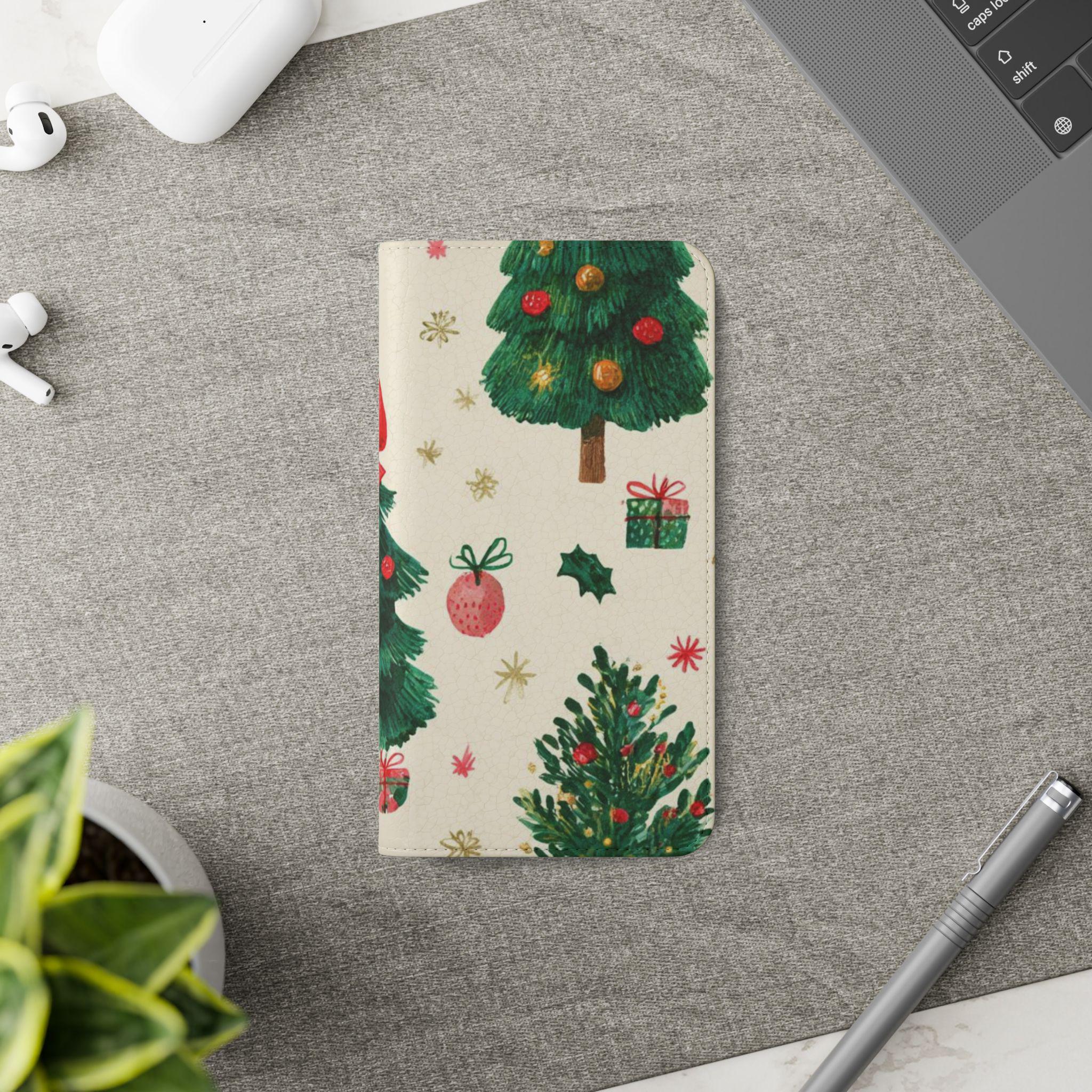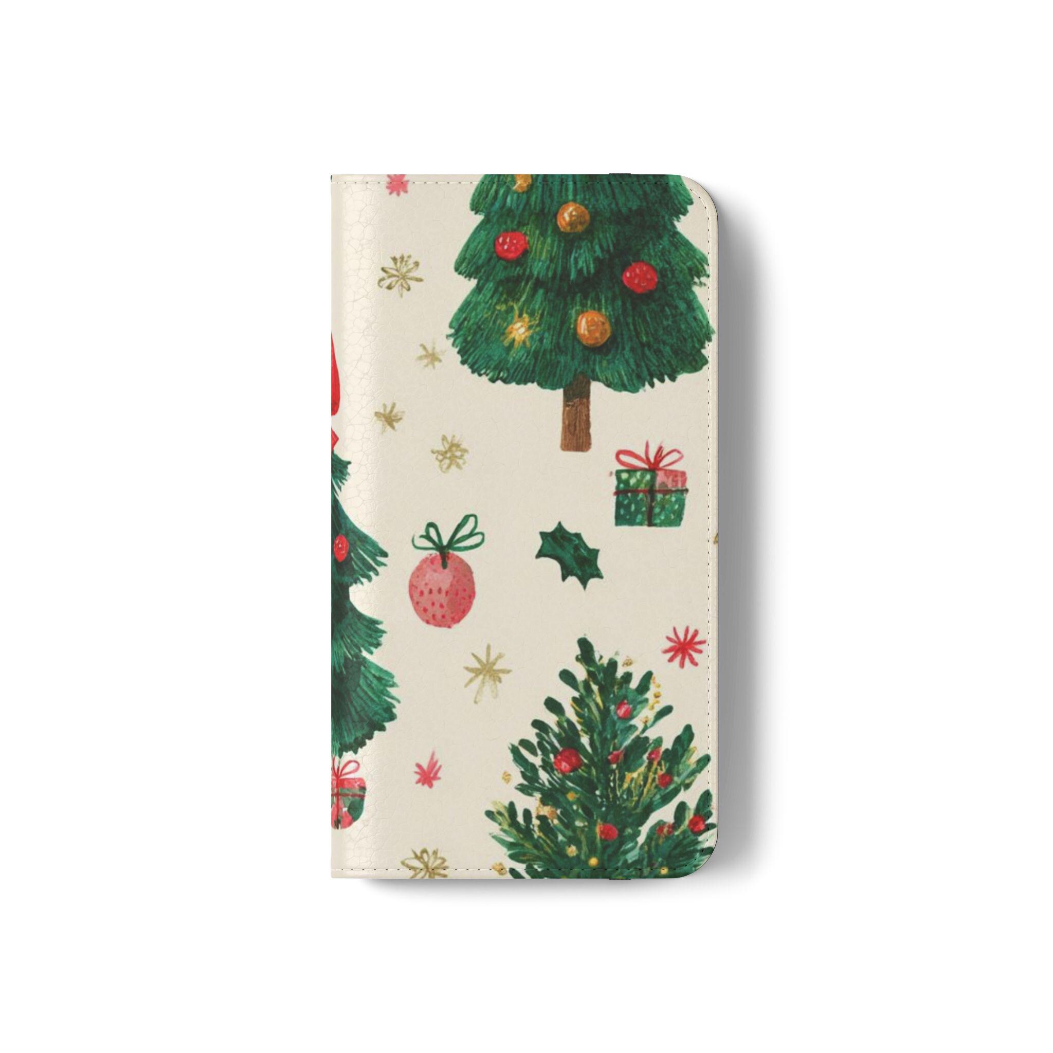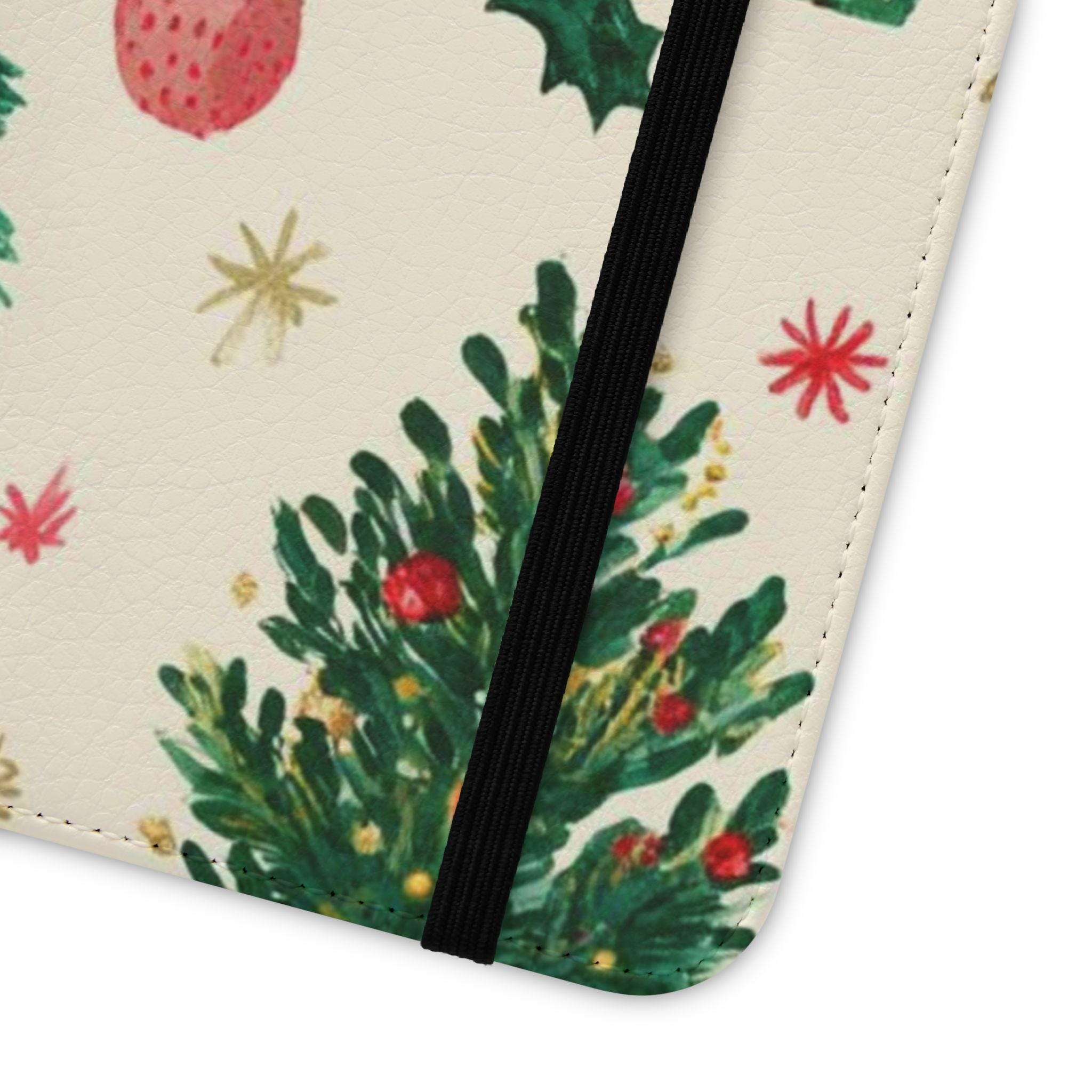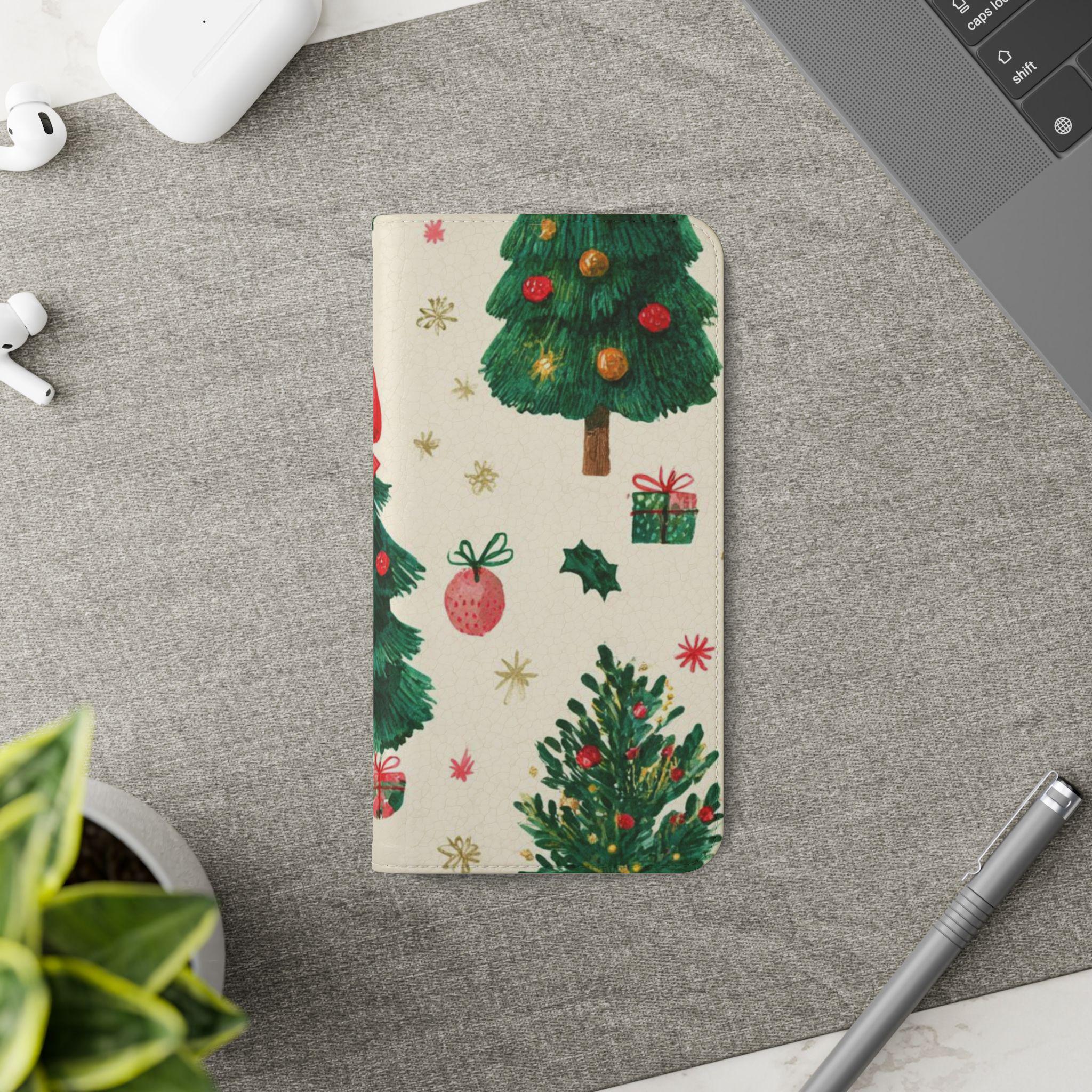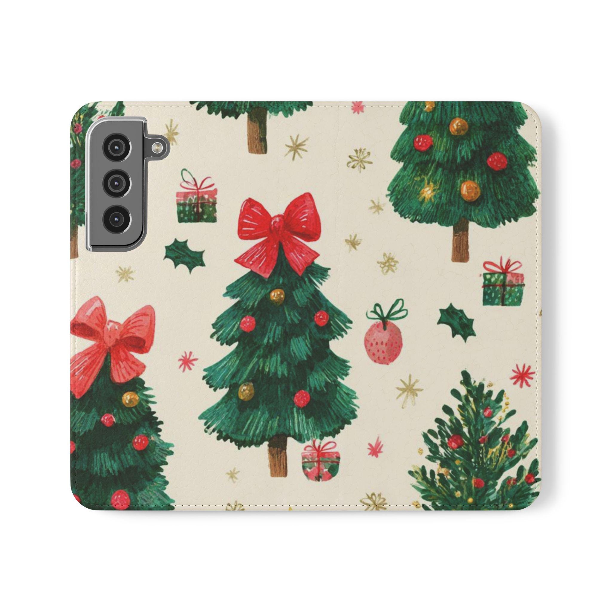 Stay organized and stylish with this Christmas tree pattern phone wallet case, perfect for the holiday season. Made from cruelty-free faux leather material, this phone case includes convenient compartments for storing cards and cash. It is ideal for adults looking for a festive and functional accessory for their phone, especially during the Christmas season.
