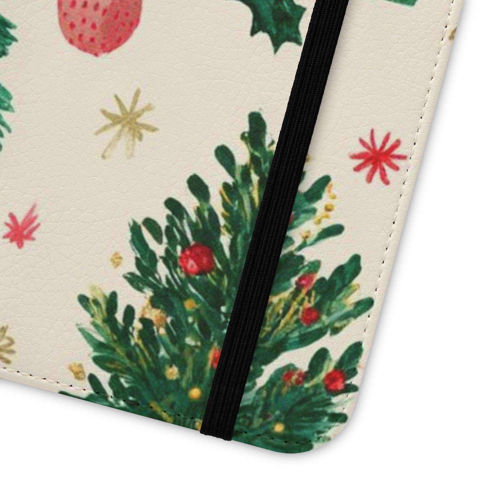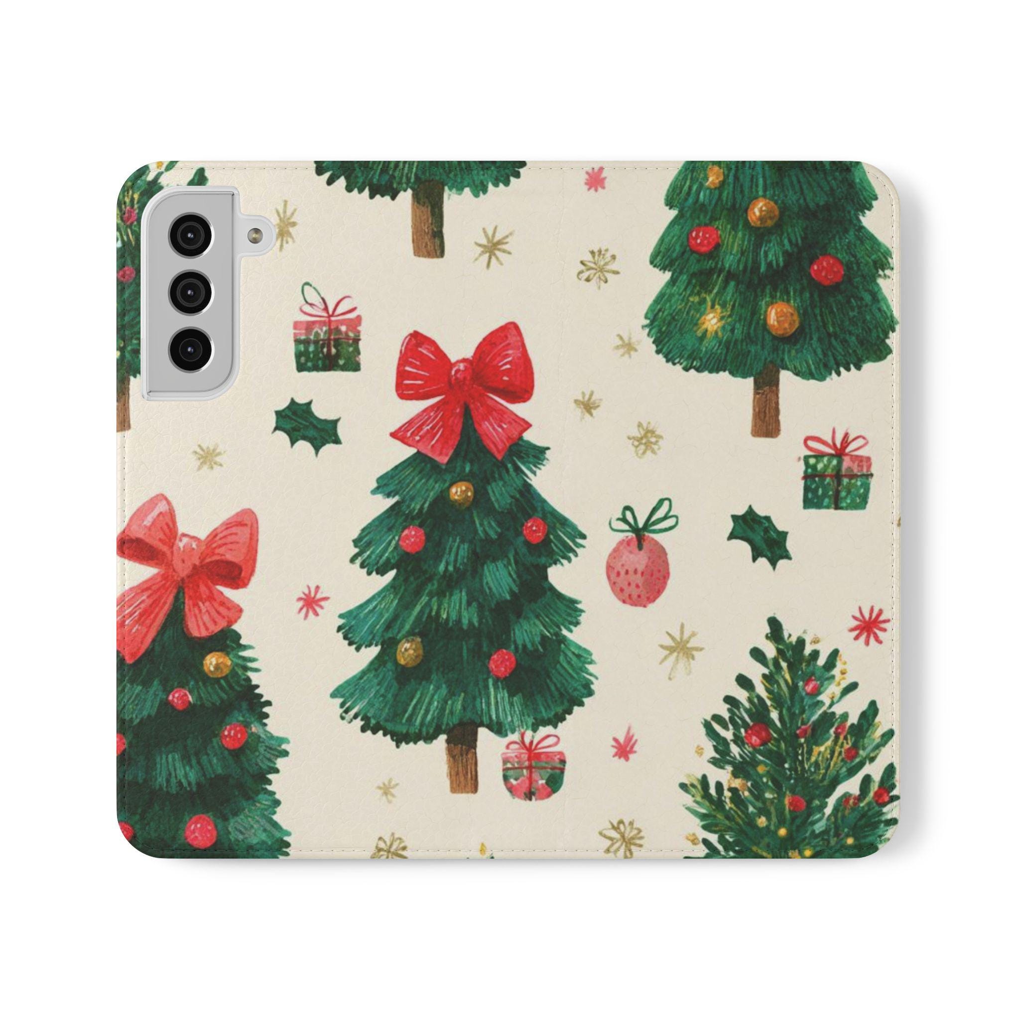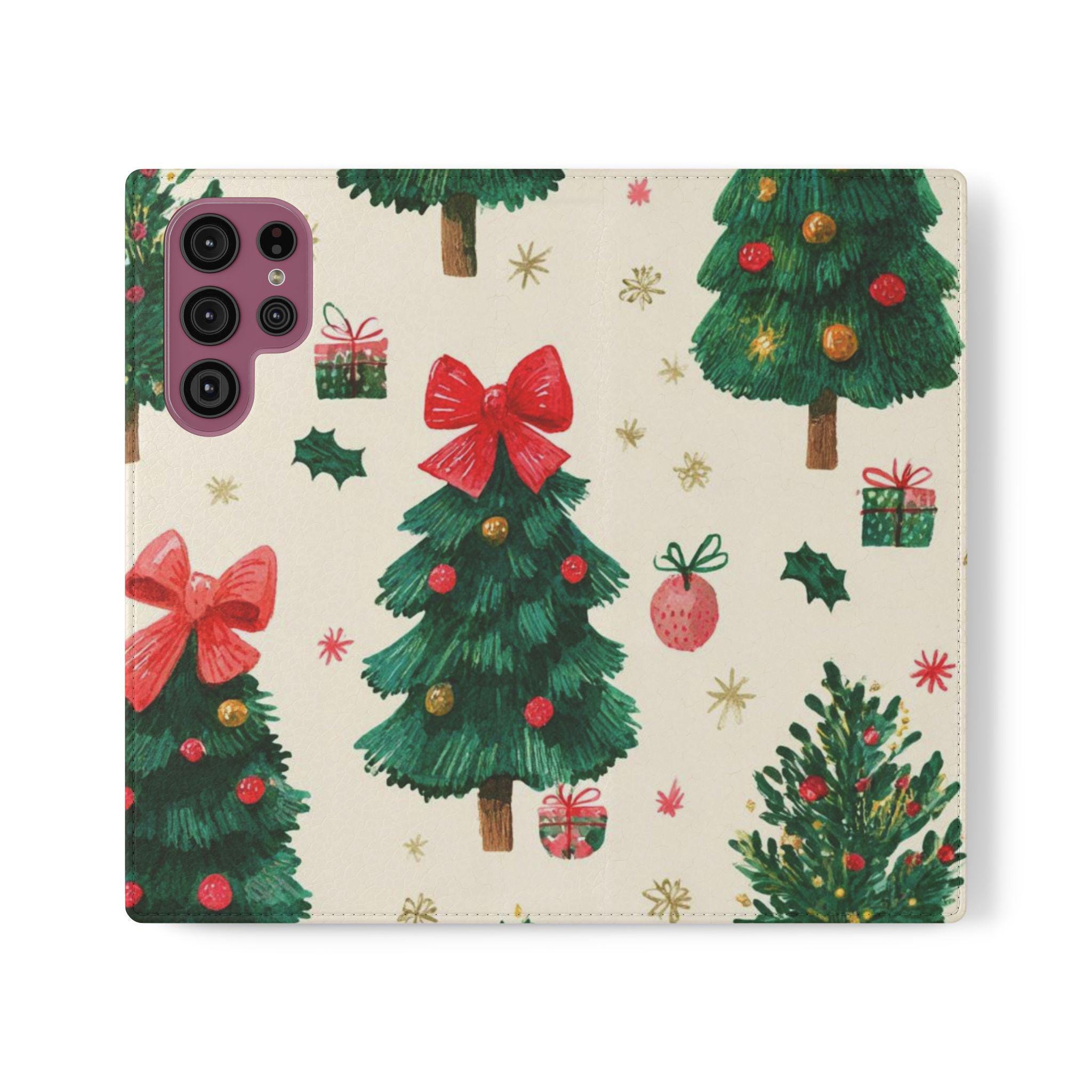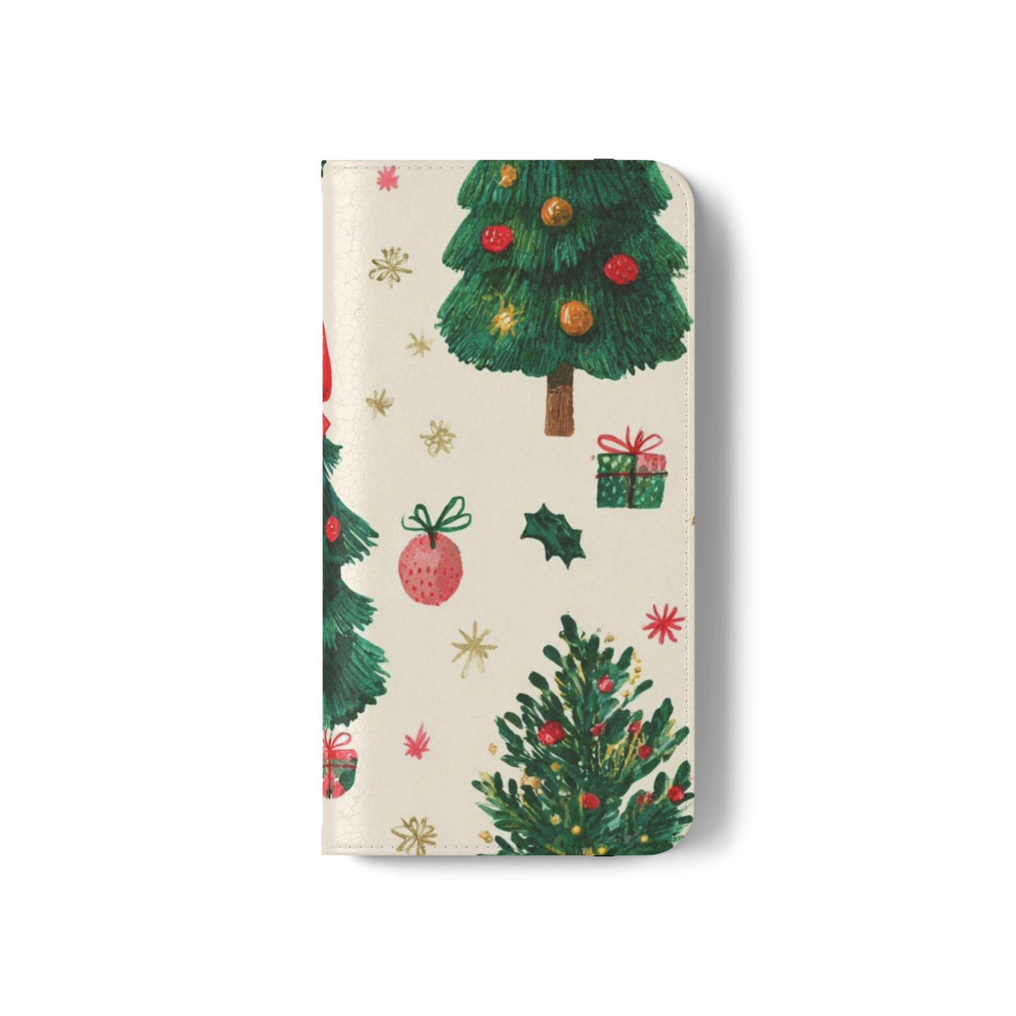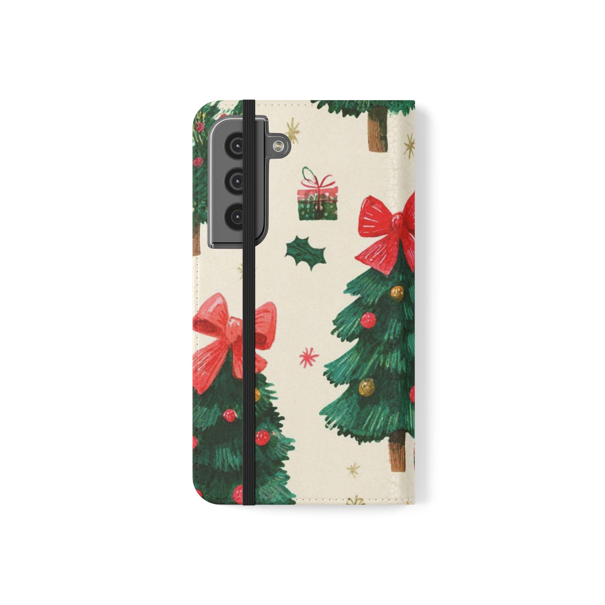 Stay organized and stylish with this Christmas tree pattern phone wallet case, perfect for the holiday season. Made from cruelty-free faux leather material, this phone case includes convenient compartments for storing cards and cash. It is ideal for adults looking for a festive and functional accessory for their phone, especially during the Christmas season.