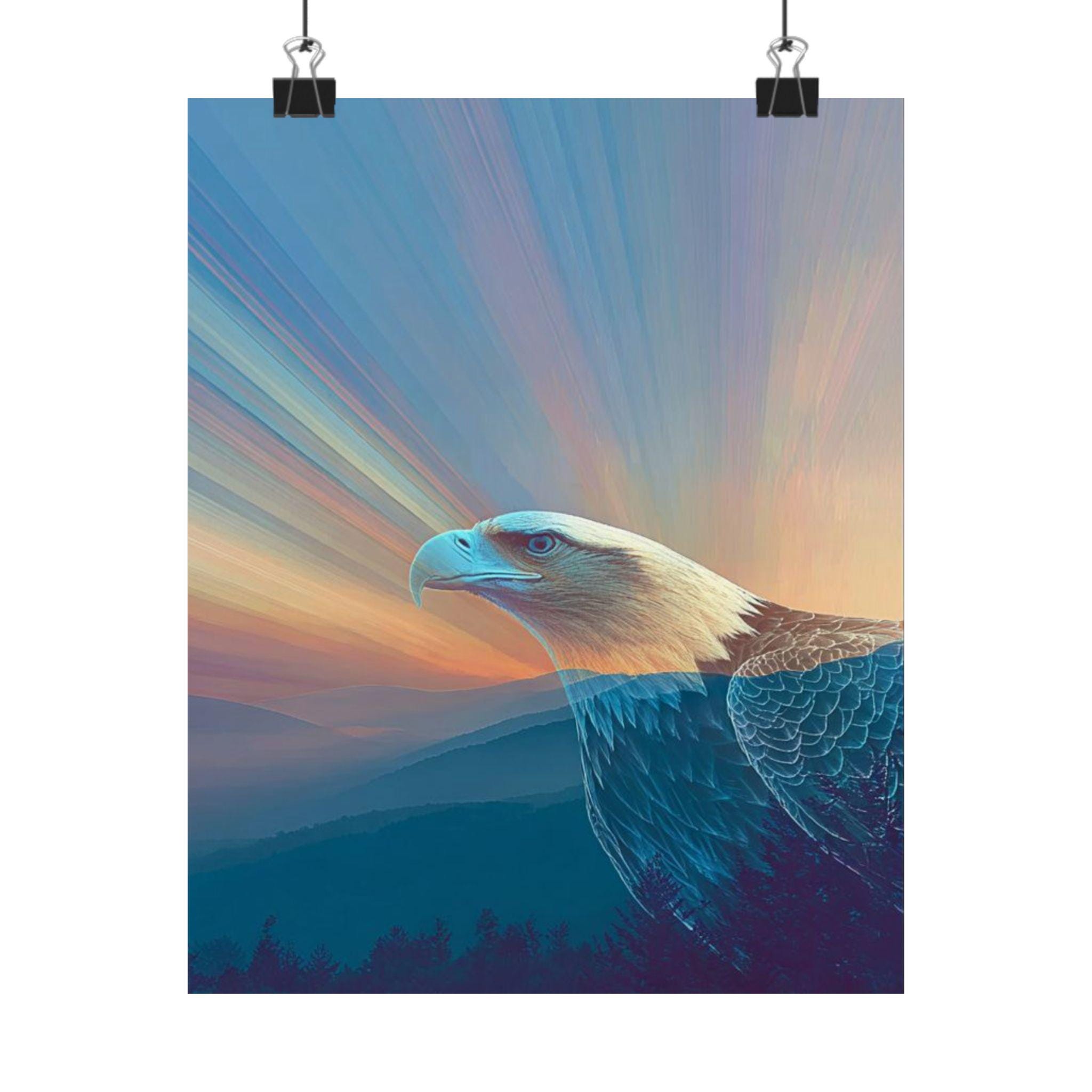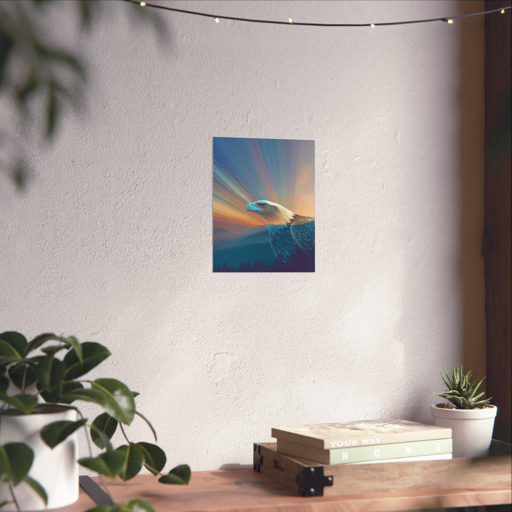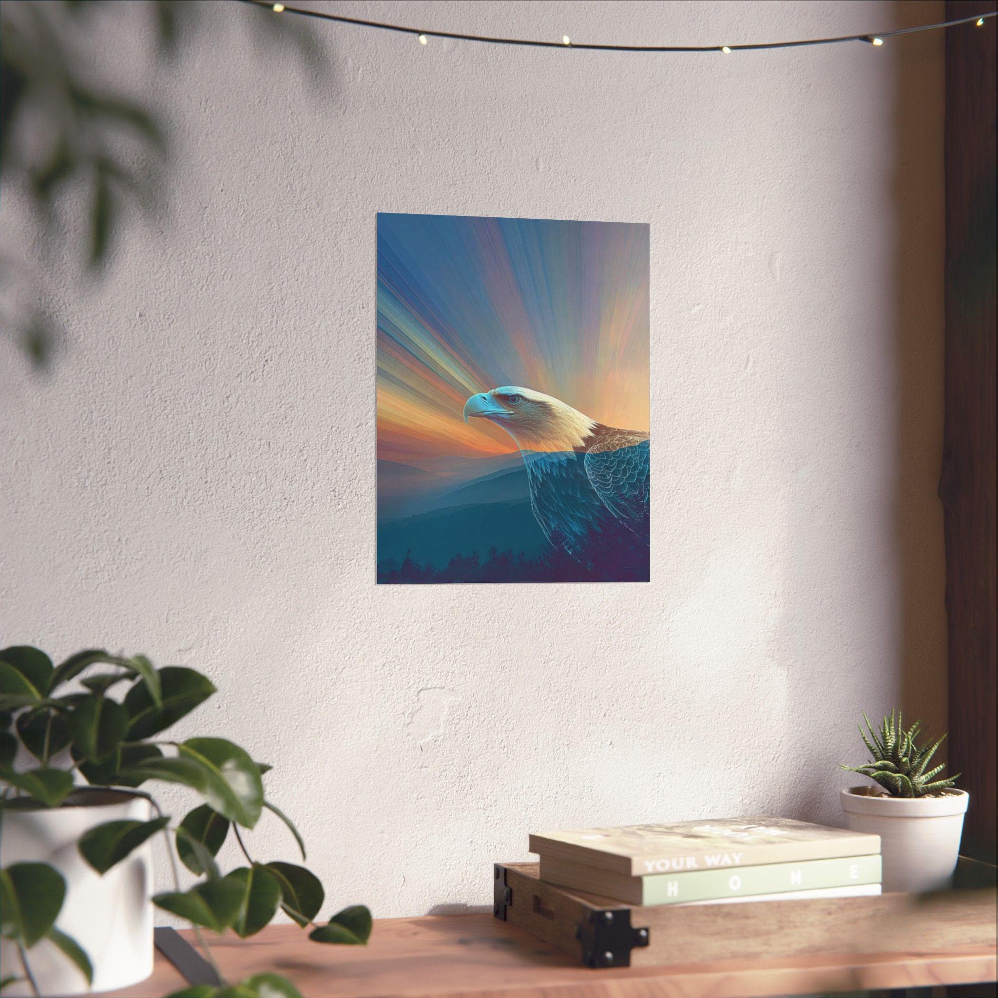 Sunlight breaks over a distant ridge, and a bald eagle takes the light — proud, watchful, unapologetically American. This matte vertical poster brings that quiet, fierce moment into your room. The soft, non-reflective finish keeps the focus on the eagle’s silhouette and the warm colors of sunrise, while archival museum-grade paper preserves those tones for years. Hang it in an entryway, study, or den to anchor a space with natural strength and national pride. It reads like a well-traveled field journal: rugged, clear, and thoughtful — the kind of piece that complements a cabin wall, a rustic office, or a collection of wildlife prints for those who treasure the outdoors and the stories it carries.