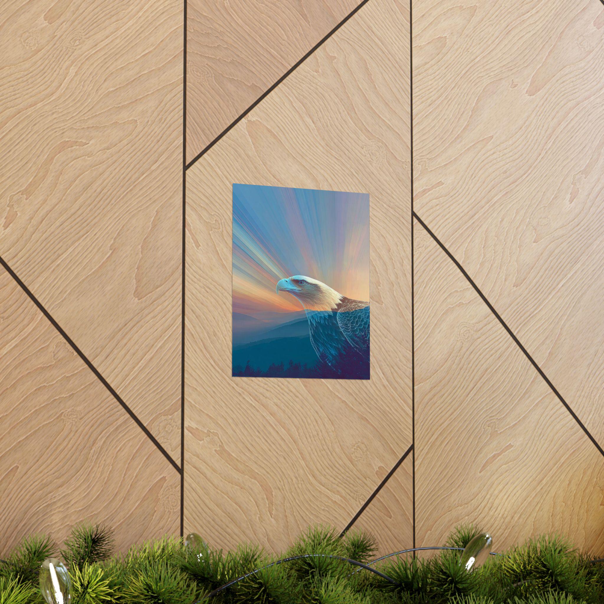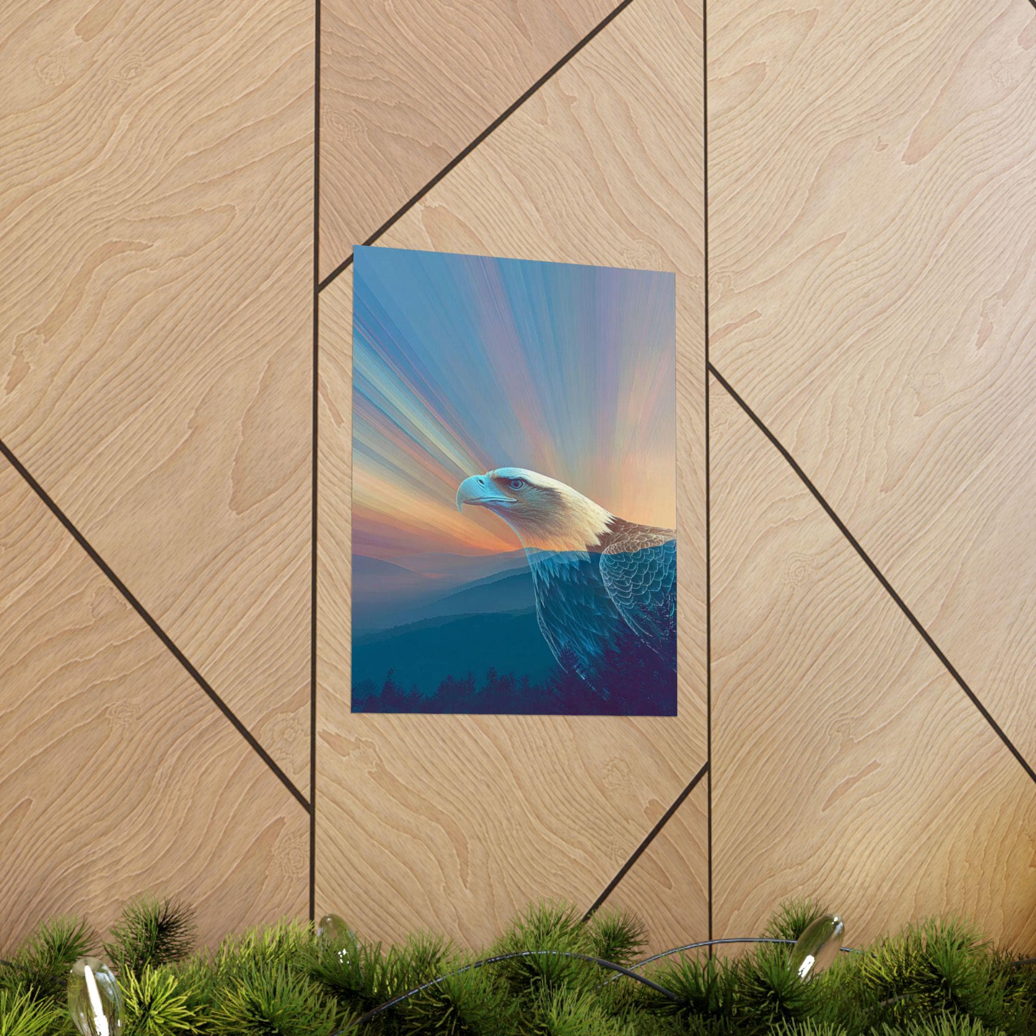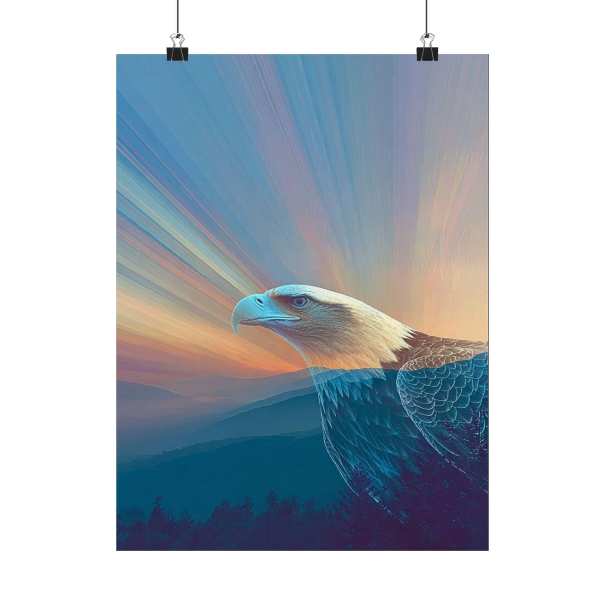 Sunlight breaks over a distant ridge, and a bald eagle takes the light — proud, watchful, unapologetically American. This matte vertical poster brings that quiet, fierce moment into your room. The soft, non-reflective finish keeps the focus on the eagle’s silhouette and the warm colors of sunrise, while archival museum-grade paper preserves those tones for years. Hang it in an entryway, study, or den to anchor a space with natural strength and national pride. It reads like a well-traveled field journal: rugged, clear, and thoughtful — the kind of piece that complements a cabin wall, a rustic office, or a collection of wildlife prints for those who treasure the outdoors and the stories it carries.