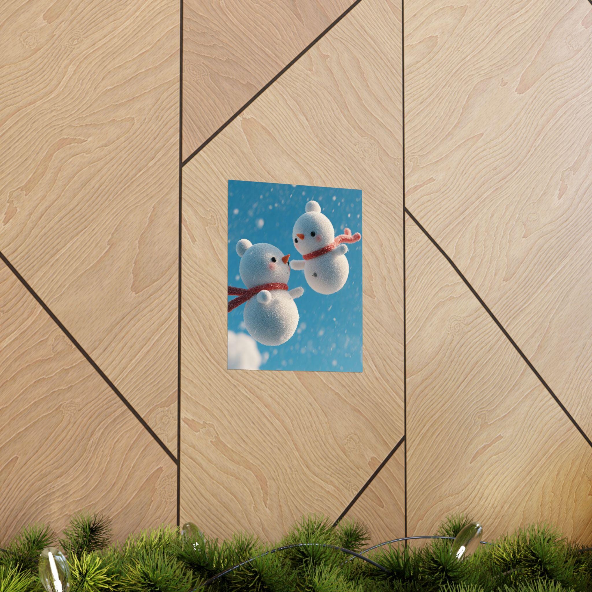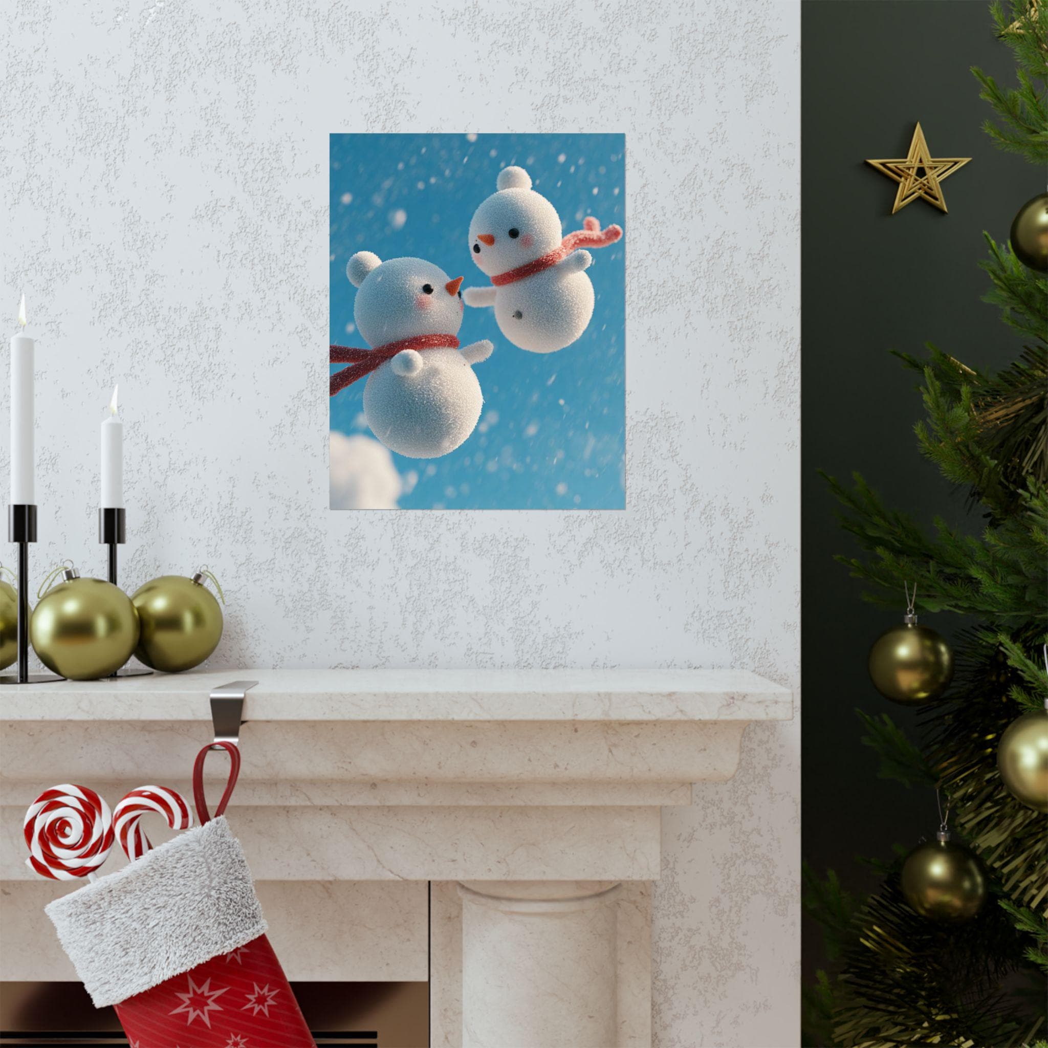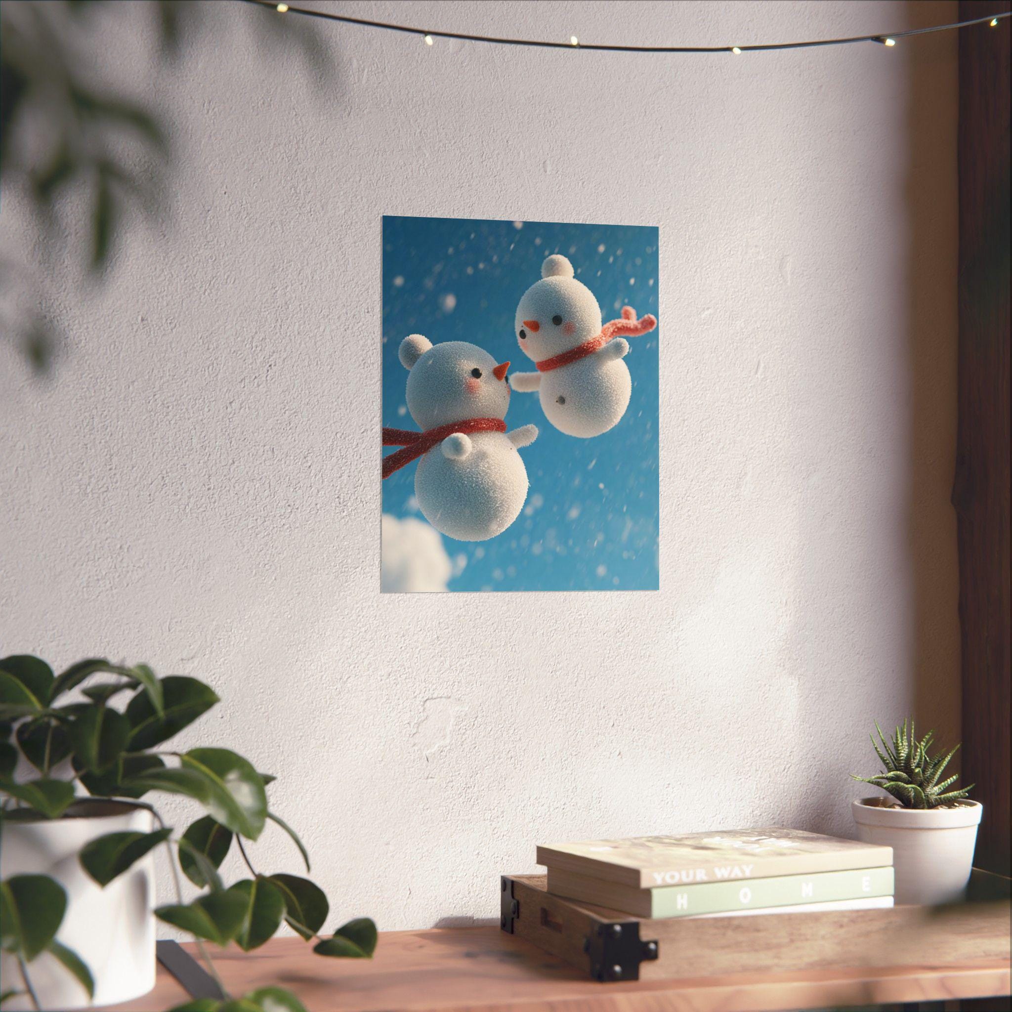 A quiet winter scene rendered with soft lines and gentle color—this matte vertical poster captures a small, floating snowman mid-drift. It feels like the hush after fresh snowfall: cool air, muted light, and a little bit of wonder. Hung on a hallway wall, above a reading nook, or layered in a seasonal gallery, the illustration brings a calm, playful note without shouting for attention. Collectors of illustration and lovers of subtle seasonal décor will appreciate the archival print quality and restrained matte finish that keeps the focus on the artwork. The range of sizes makes it easy to place alone as a focal piece or grouped with other seasonal art for a cozy winter display.