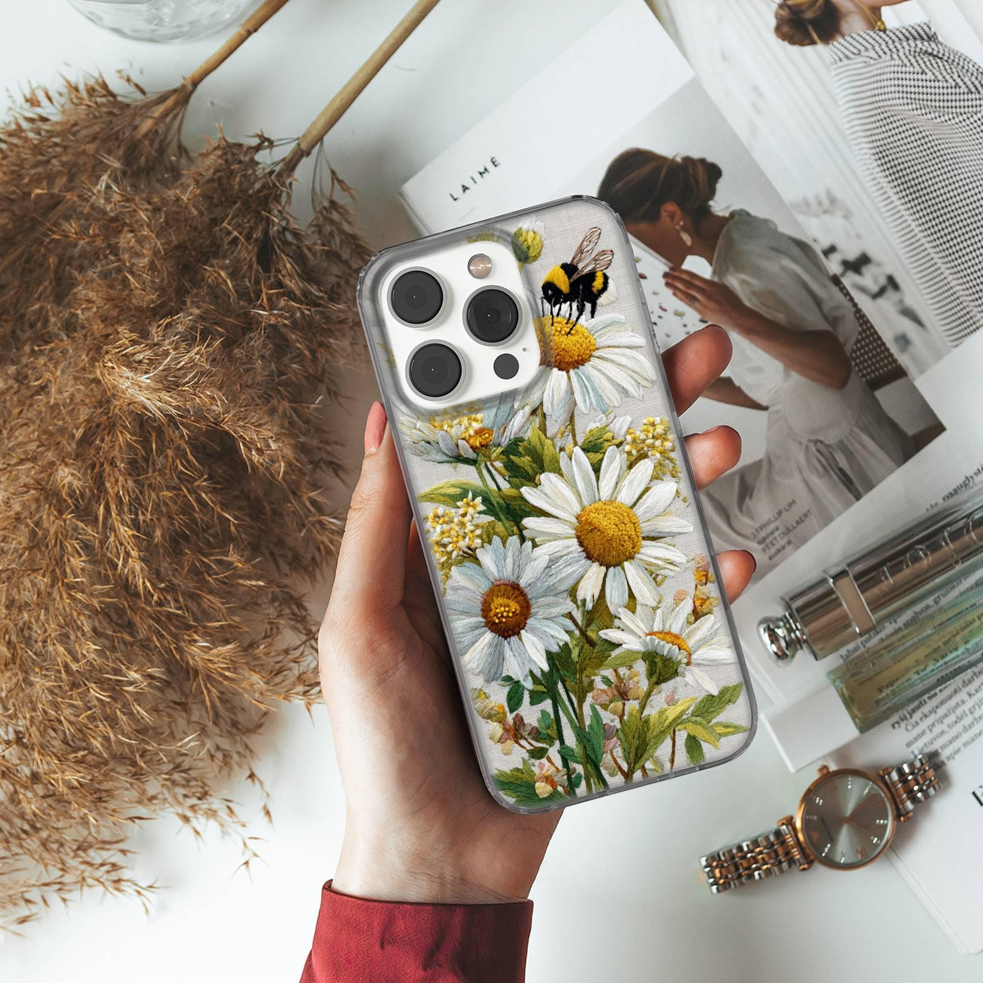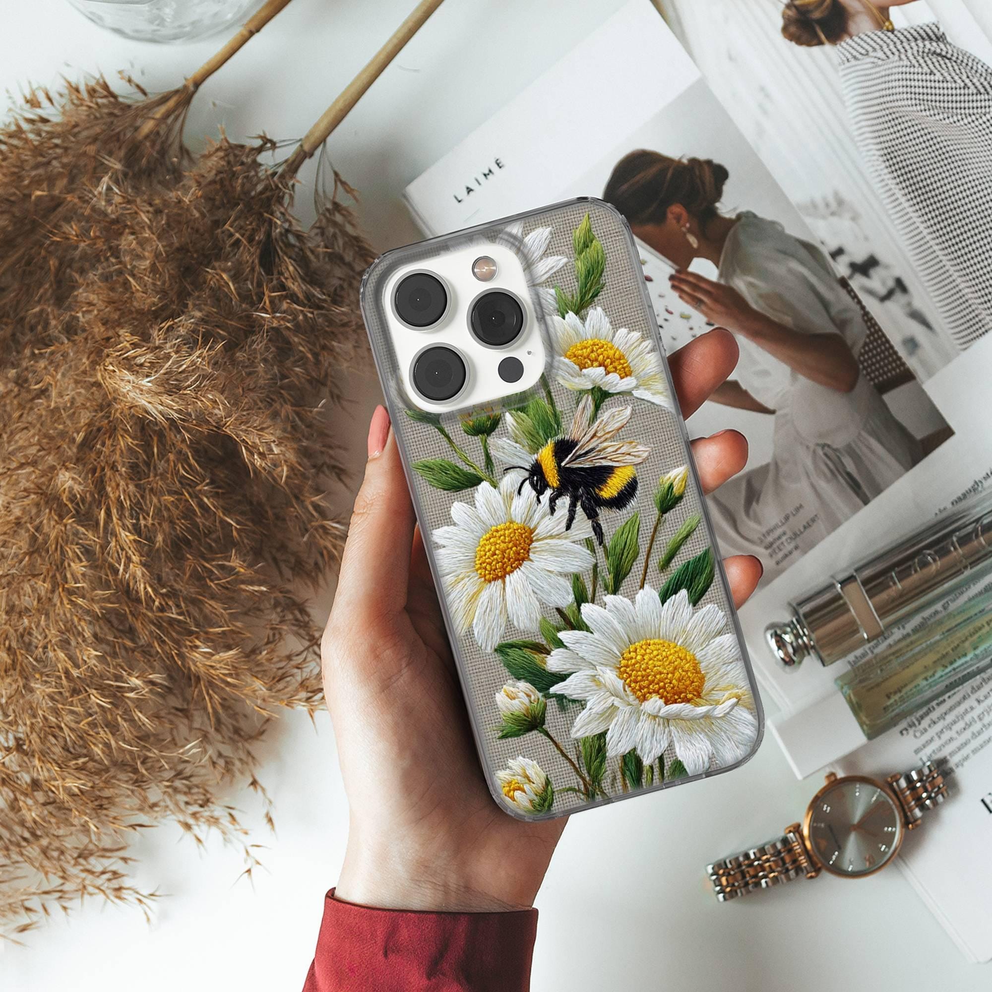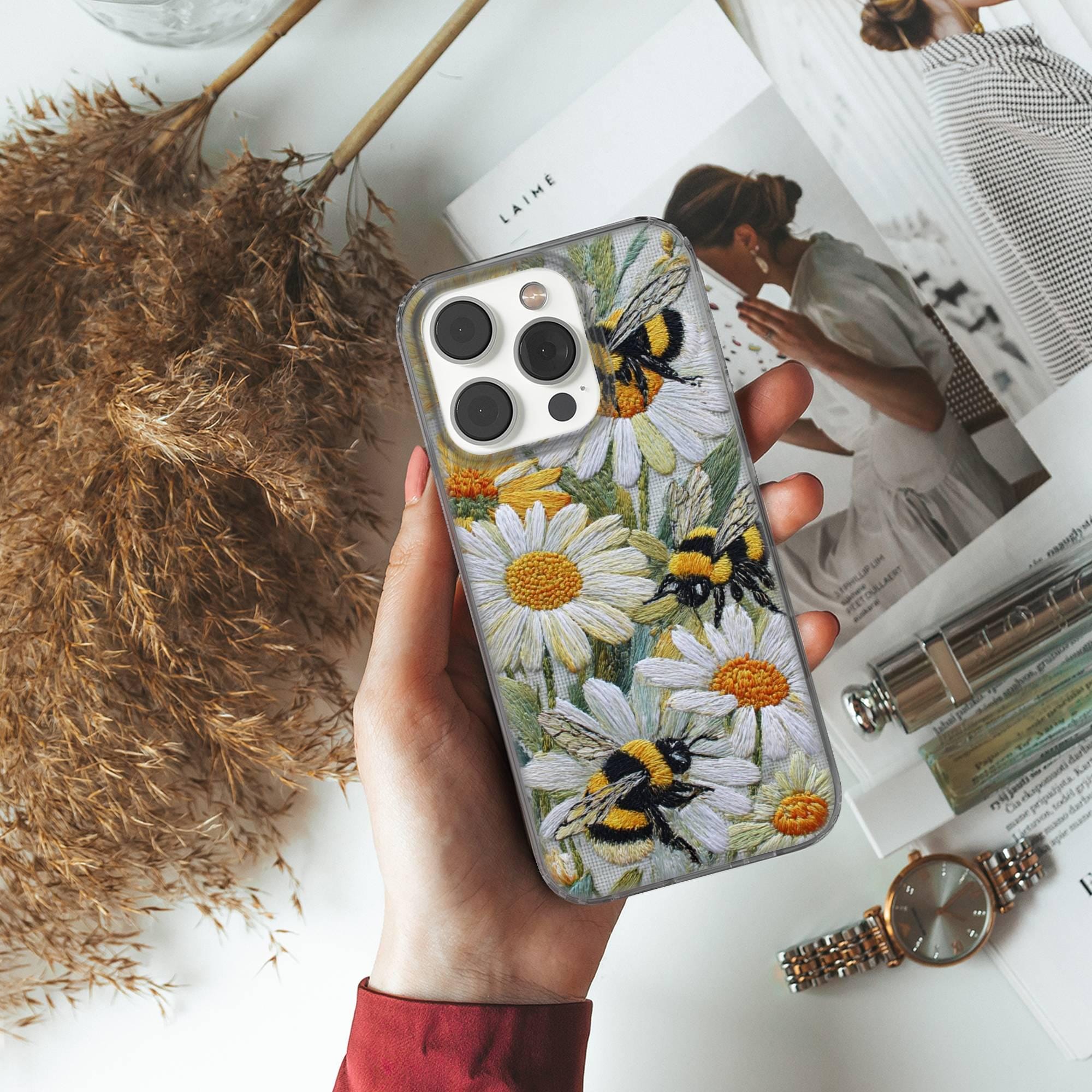 This Floral Bee Phone case keeps your phone safe and stylish. This case is designed with a thin and lightweight gel (TPU) material that perfectly fits your device. Featuring Faux Embroidery elegant design, this phone case is sure to add a touch of whimsy to your everyday life.