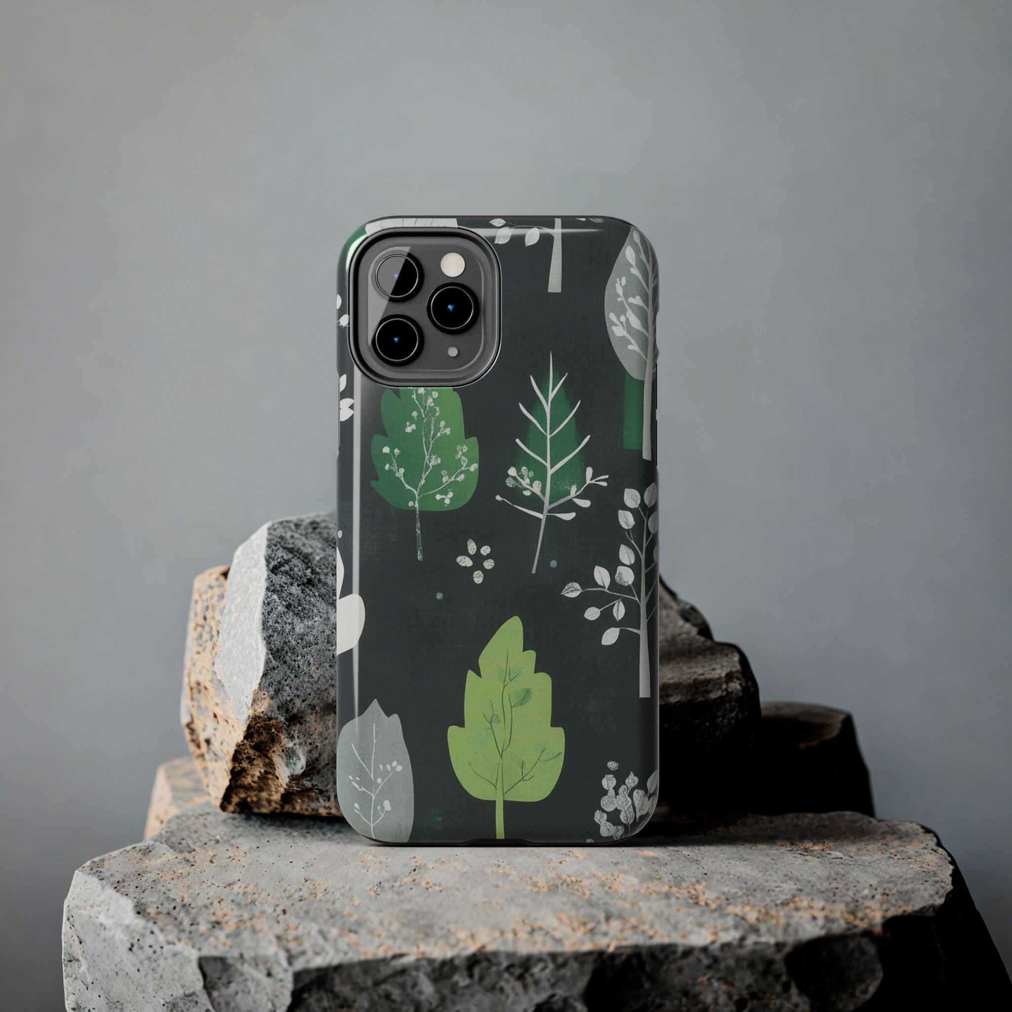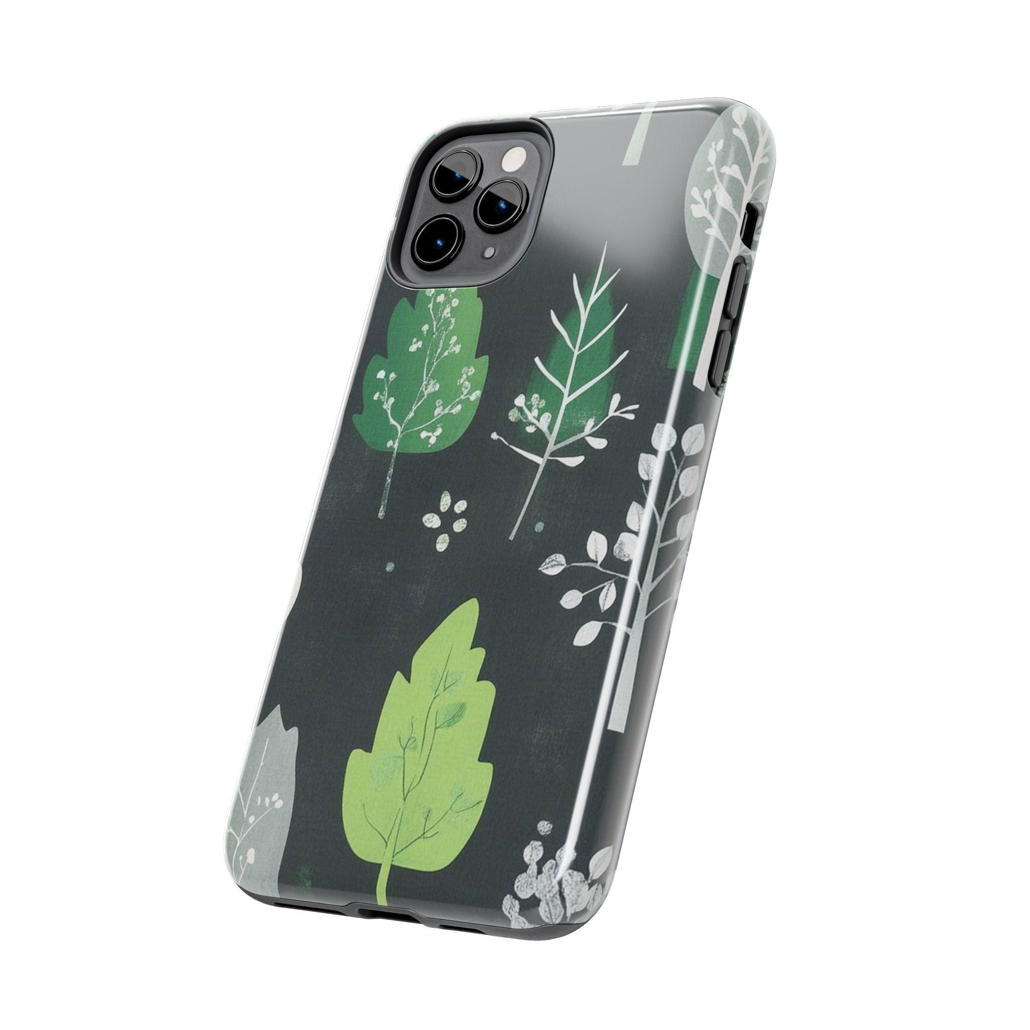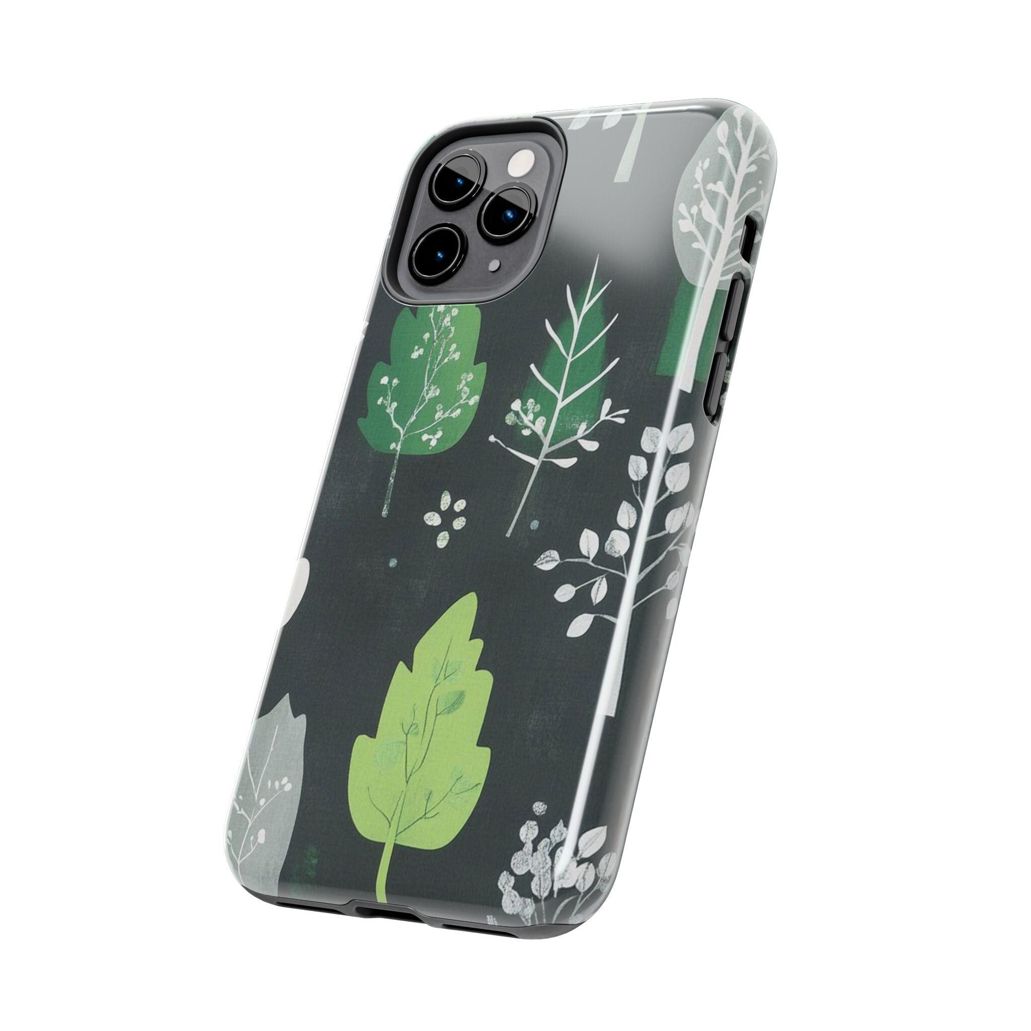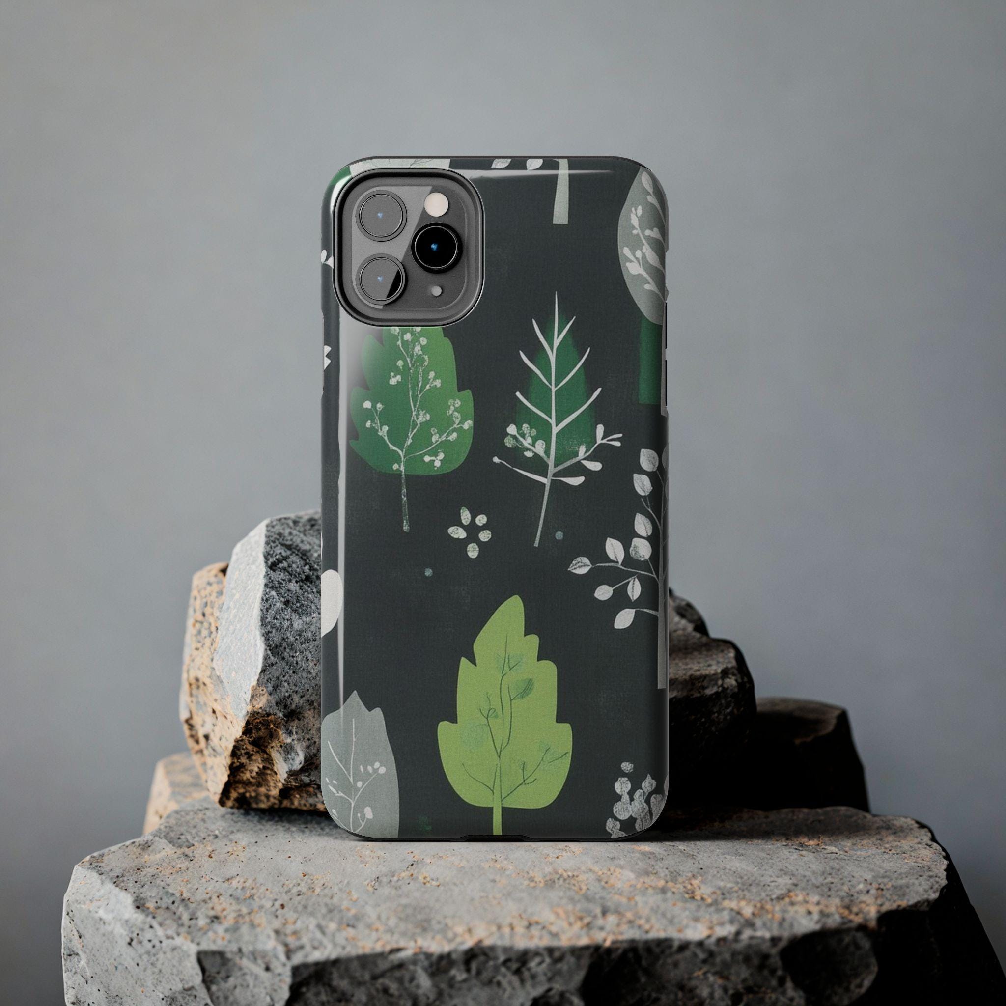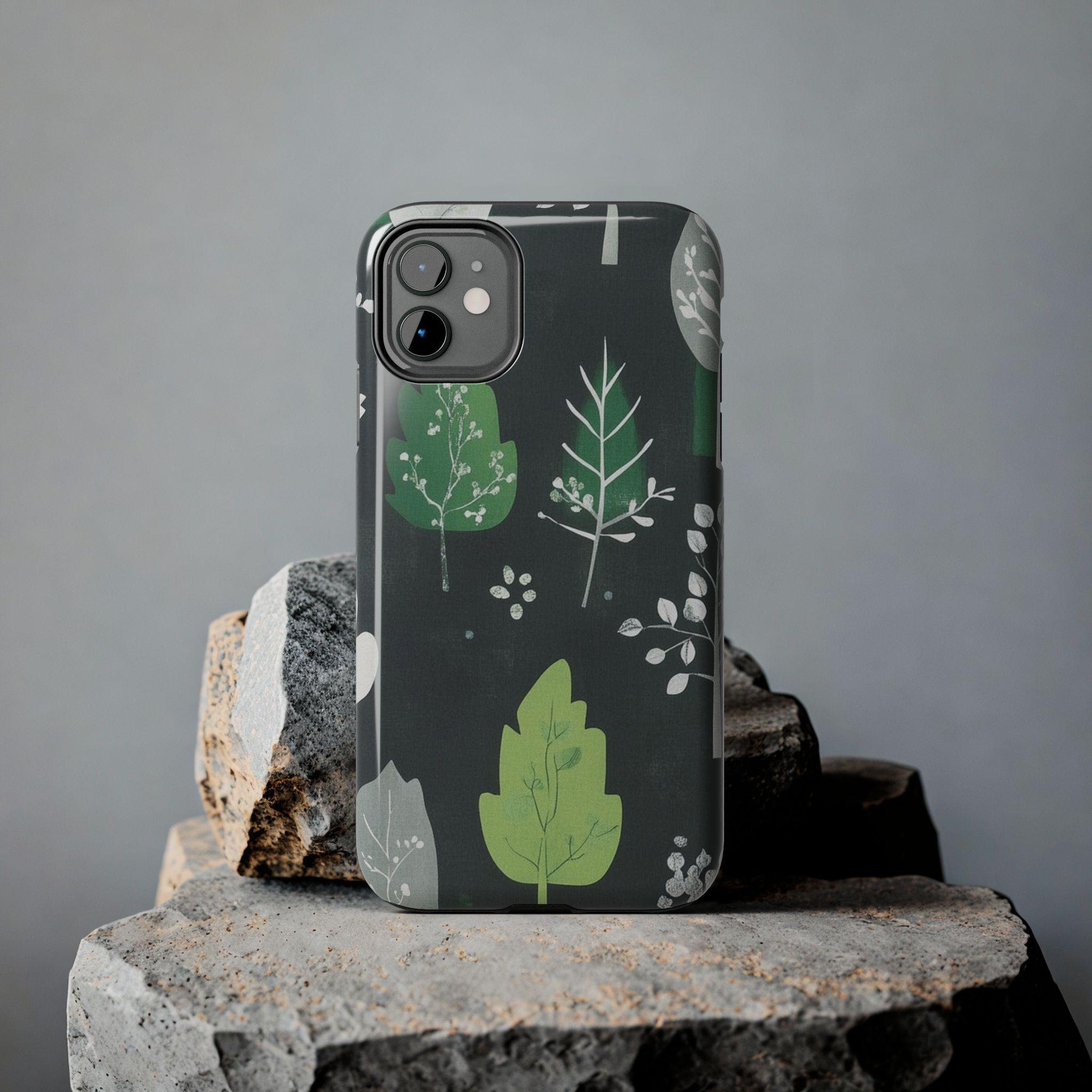 A slim, protective phone case with a soft botanical design that brings a calm, forest-like vibe to your every day. The two-piece construction combines a hard polycarbonate shell with an interior TPU liner to absorb shocks and disperse impacts. A glossy, full-color finish highlights the hand-drawn leaves and subtle foliage on a deep charcoal background, while a lay-flat bezel helps keep the screen safe from light scratches. Lightweight and weather-resistant, this case slips into pockets and backpacks easily and supports wireless charging.
