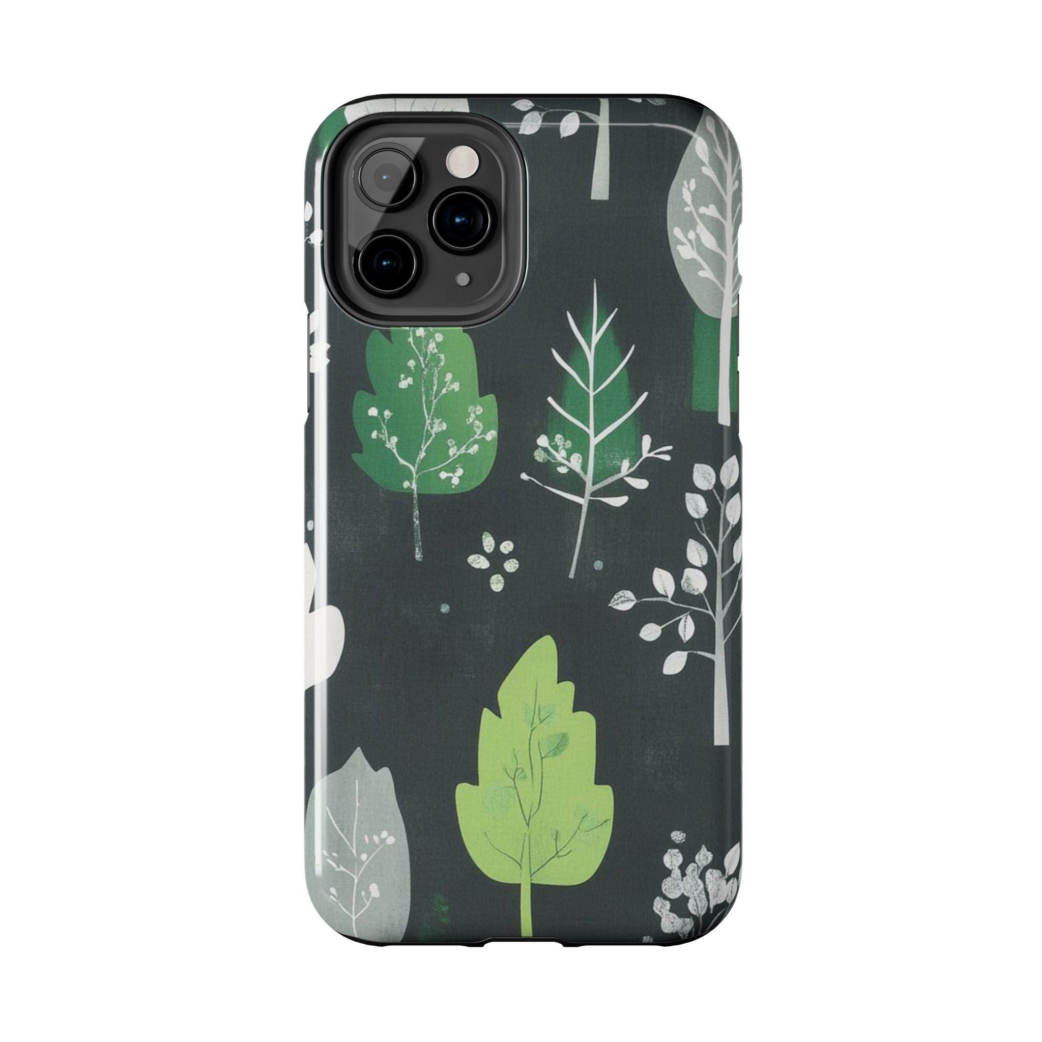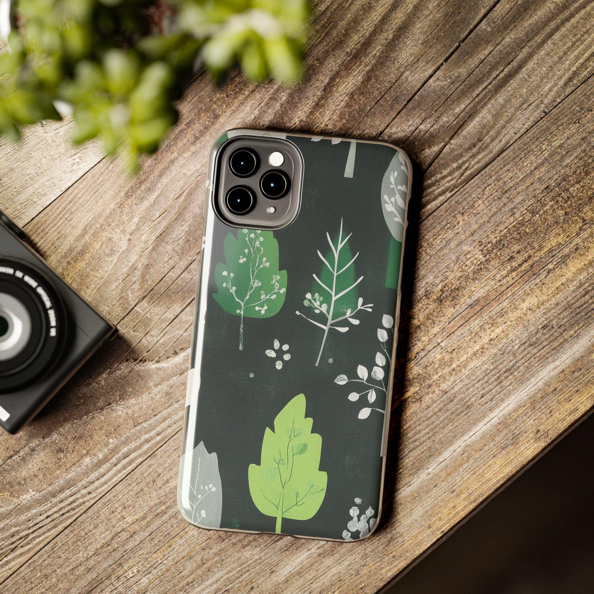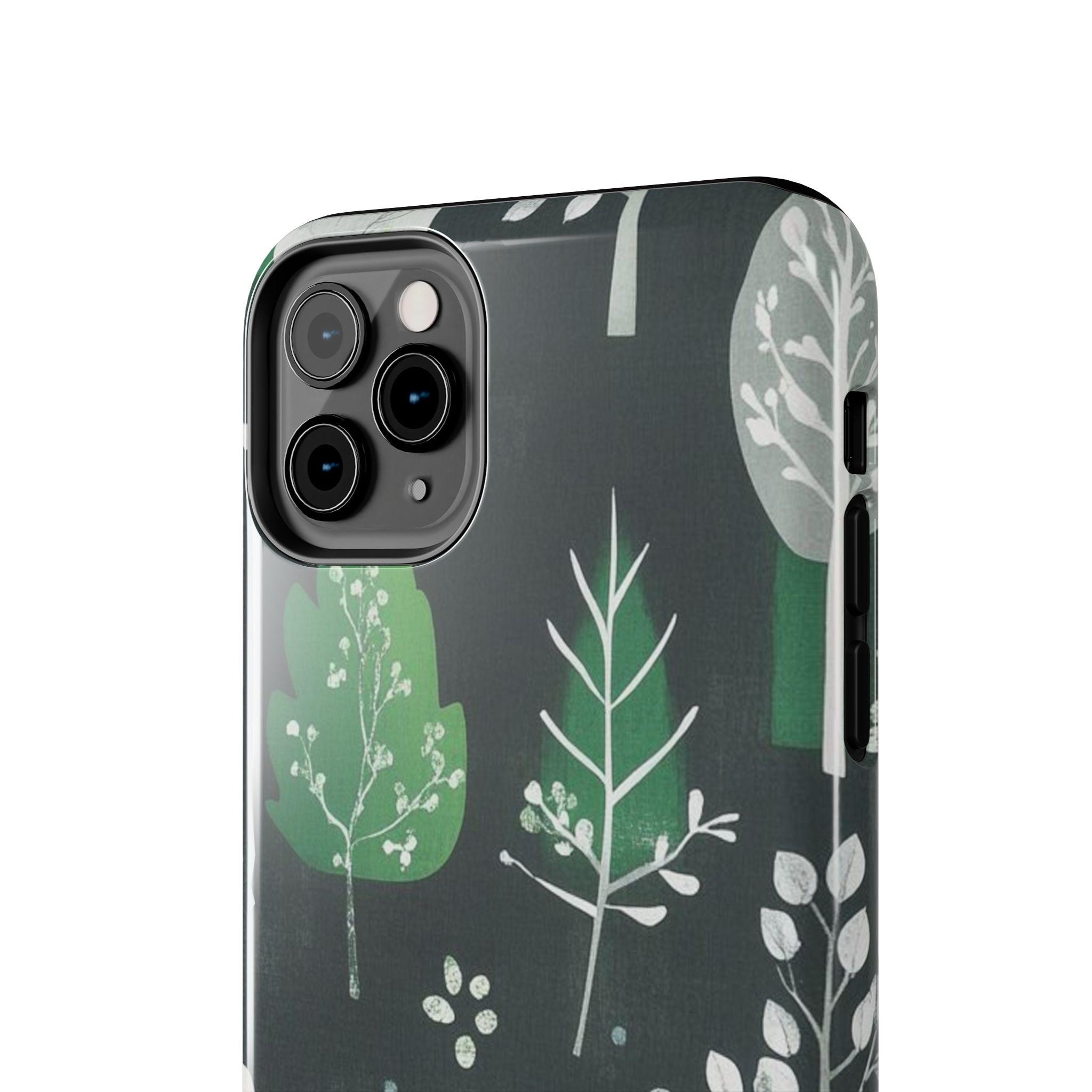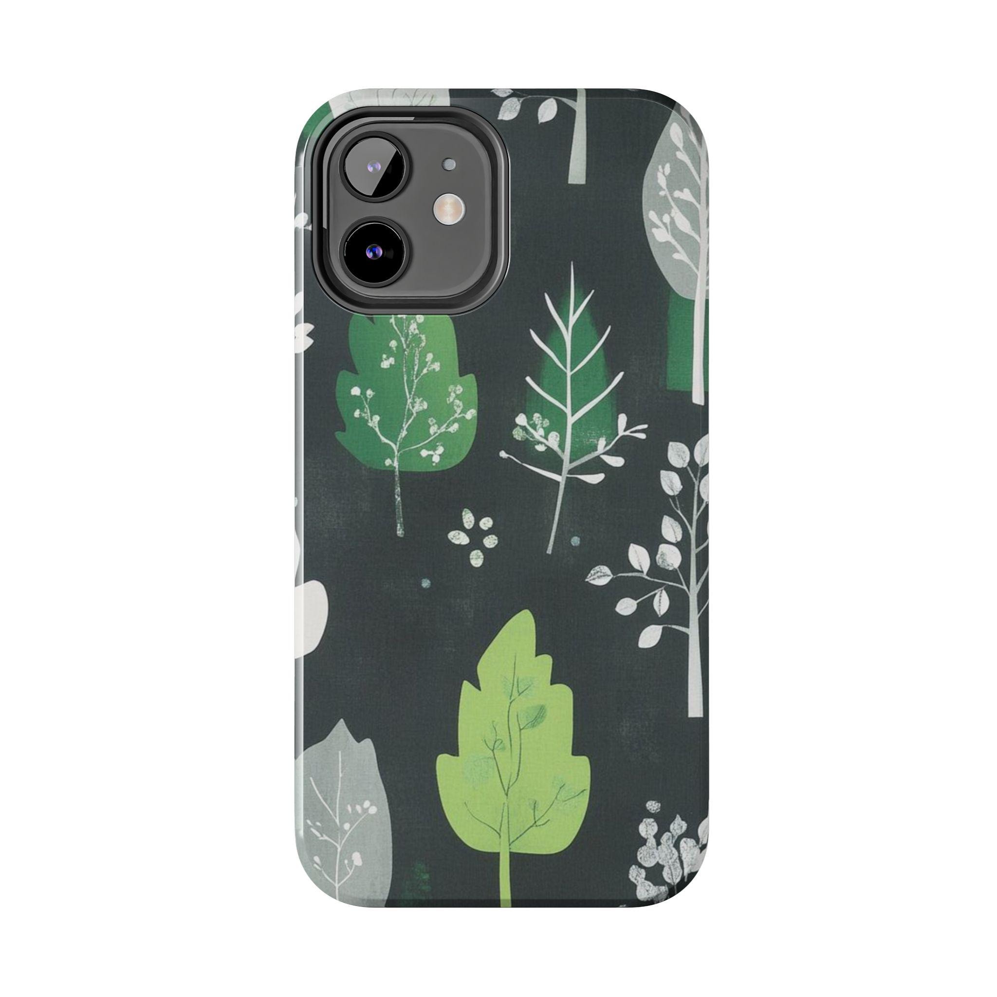 A slim, protective phone case with a soft botanical design that brings a calm, forest-like vibe to your every day. The two-piece construction combines a hard polycarbonate shell with an interior TPU liner to absorb shocks and disperse impacts. A glossy, full-color finish highlights the hand-drawn leaves and subtle foliage on a deep charcoal background, while a lay-flat bezel helps keep the screen safe from light scratches. Lightweight and weather-resistant, this case slips into pockets and backpacks easily and supports wireless charging.