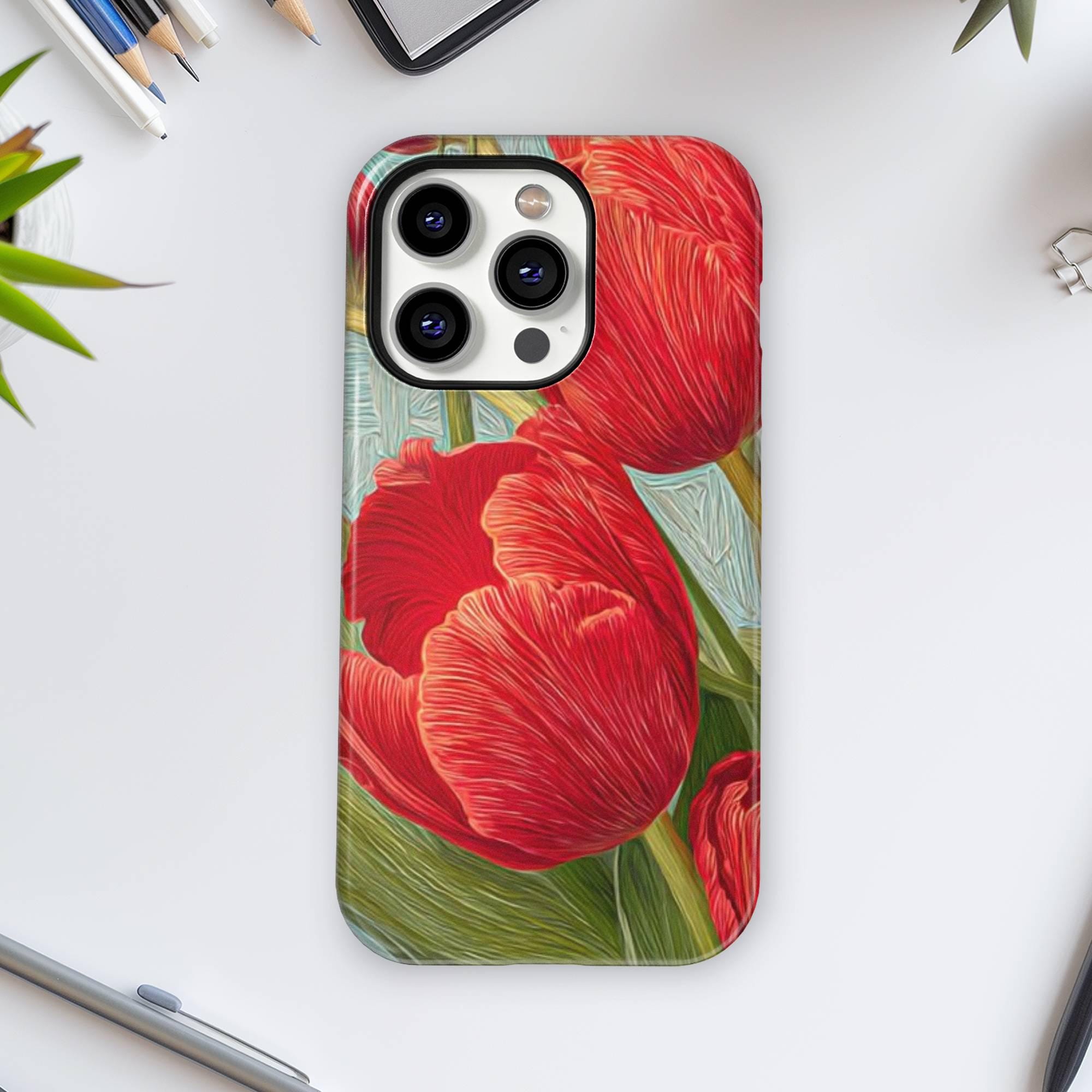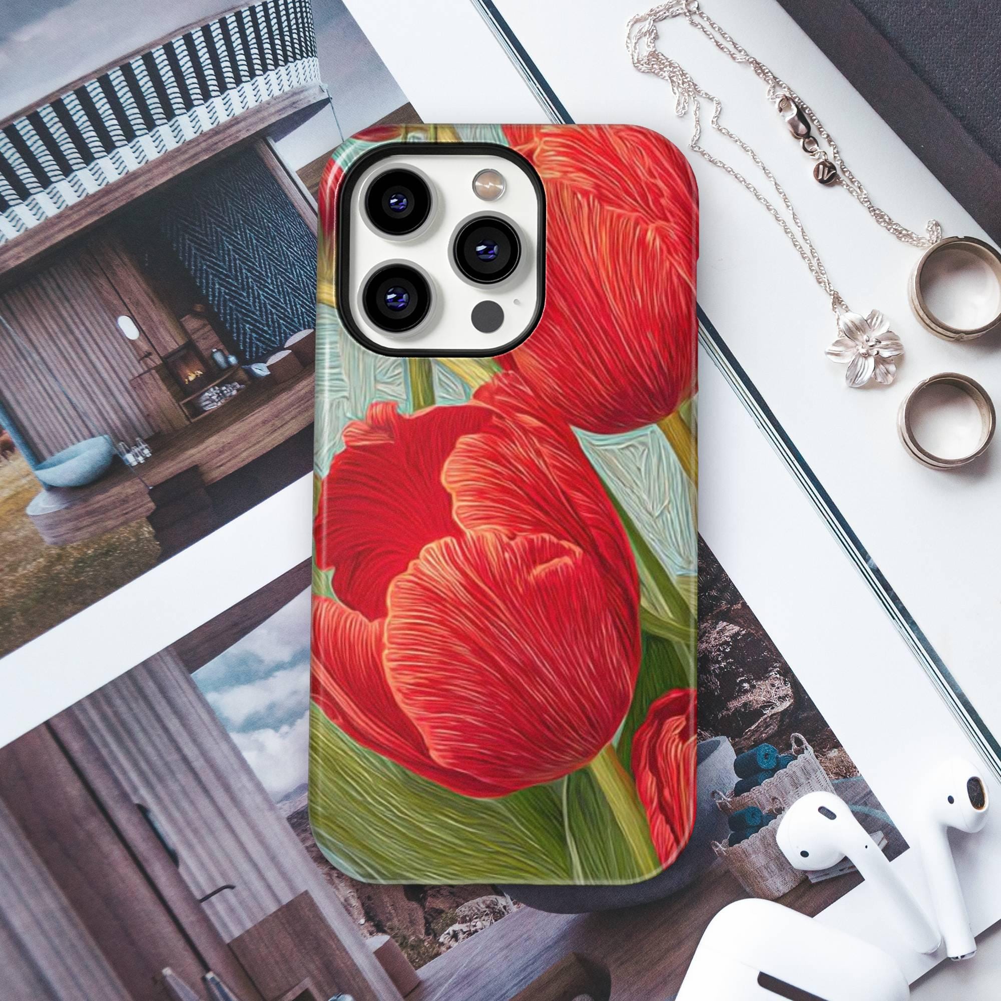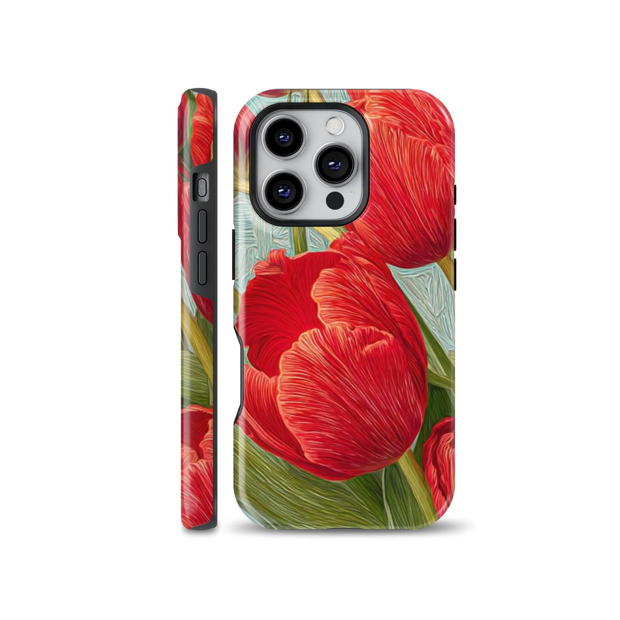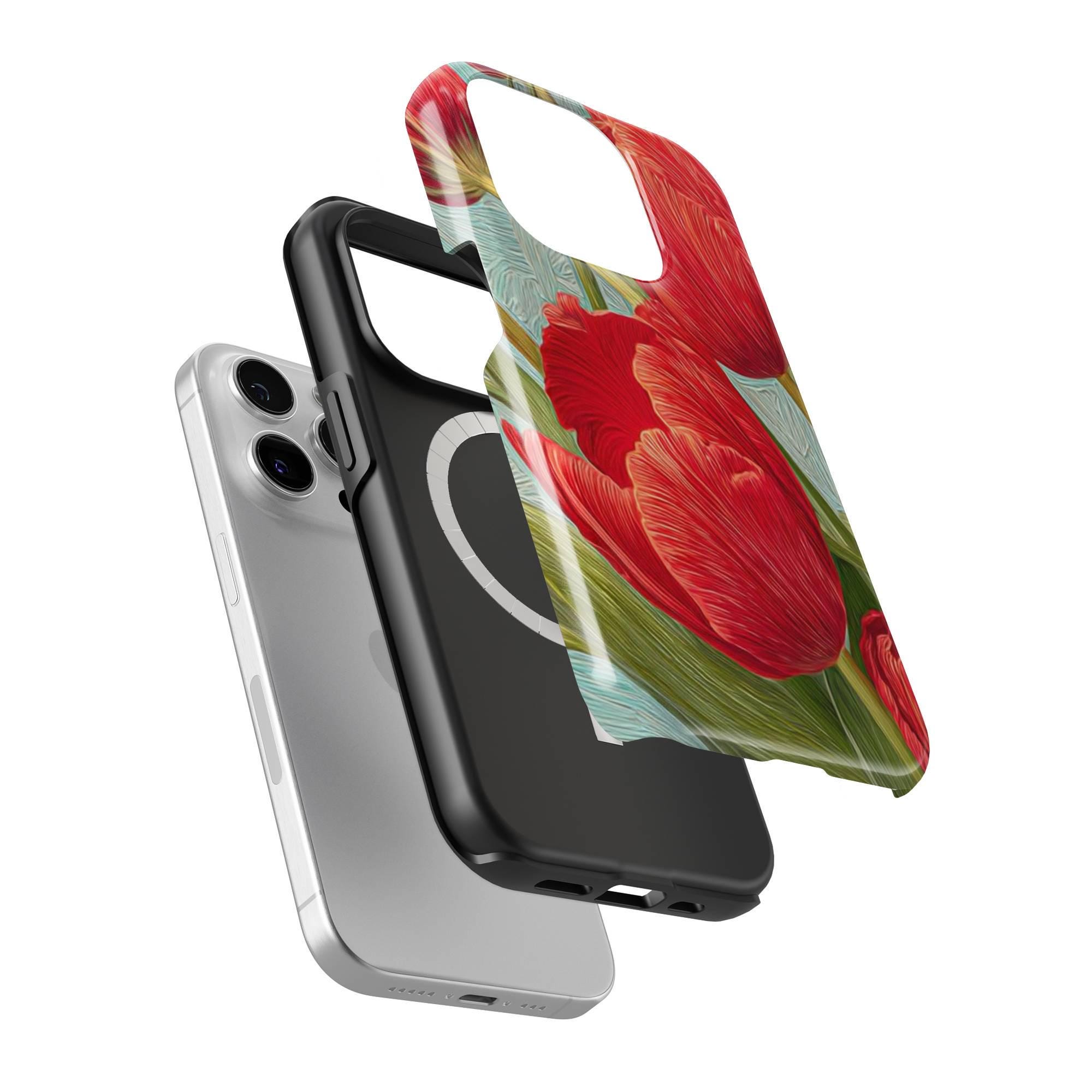 Add a burst of botanical beauty to your iPhone with our RED TULIPS Phone Case featuring a stunning spring floral design. Crafted from premium quality white plastic and a TPU insert for dual protection, this MagSafe-compatible cover ensures your phone stays safe from everyday bumps and drops while exuding elegance and whimsy. Perfectly designed for models like iPhone 16, 15 Pro, 14 Pro Max, 12, and 17 MagSafe, it offers seamless magnetic attachment for quick, secure charging.