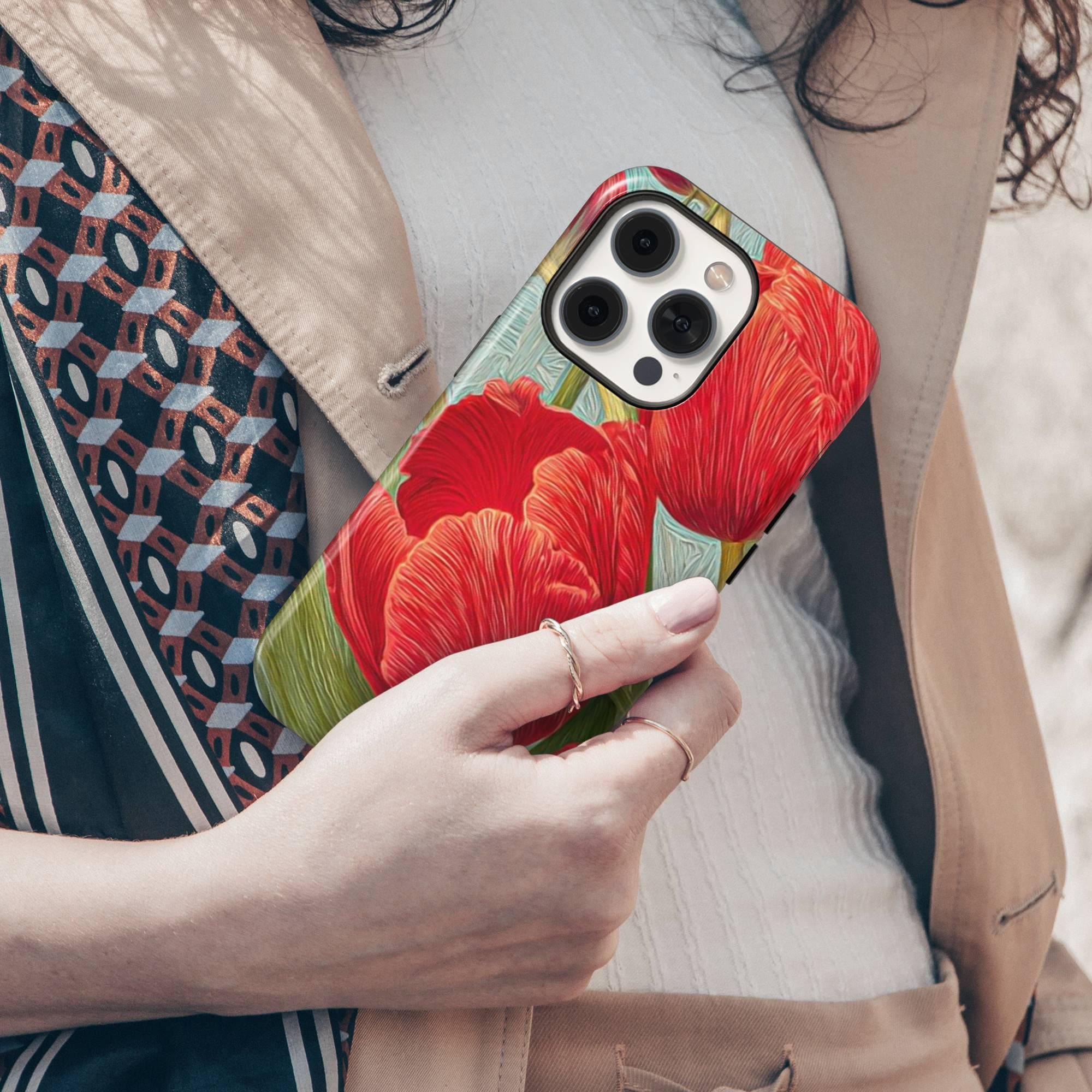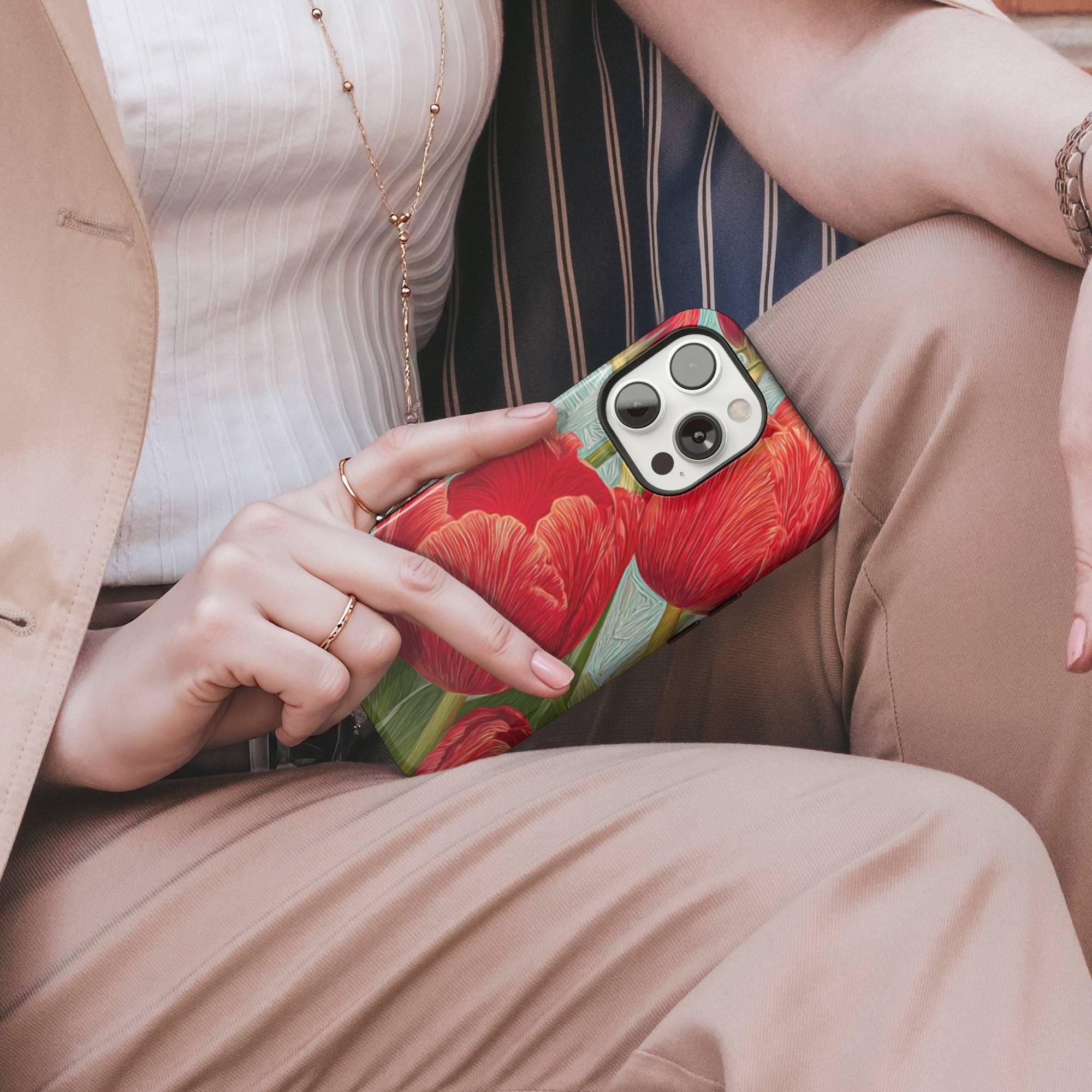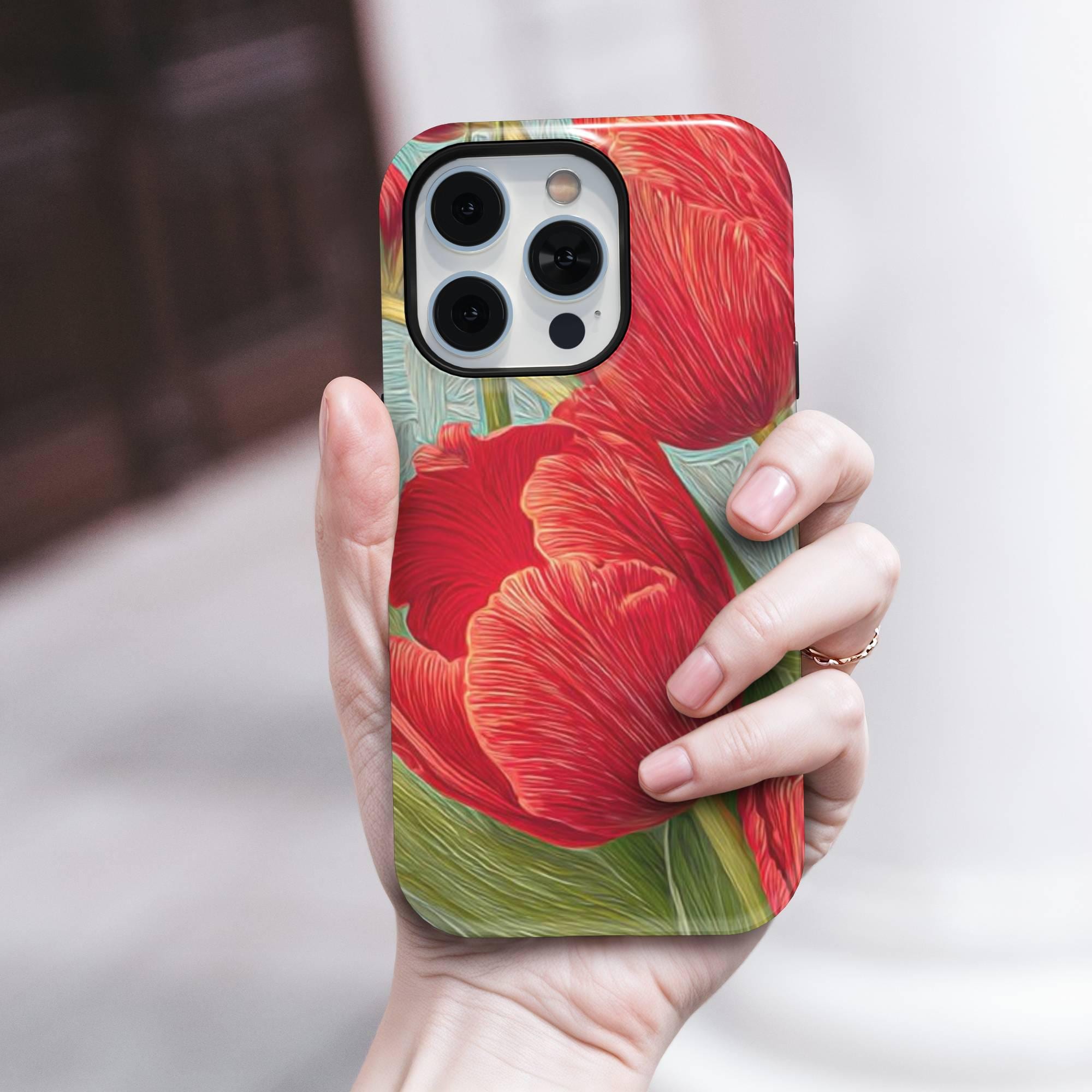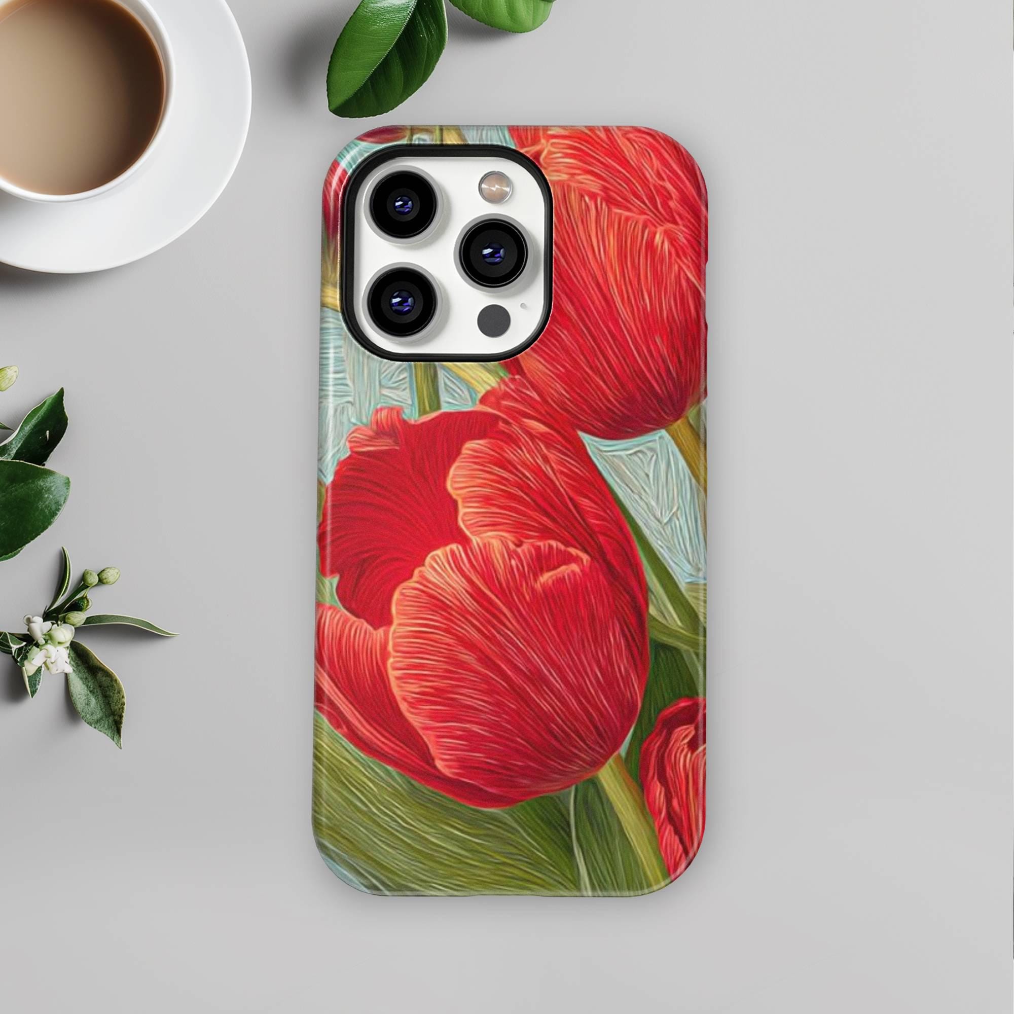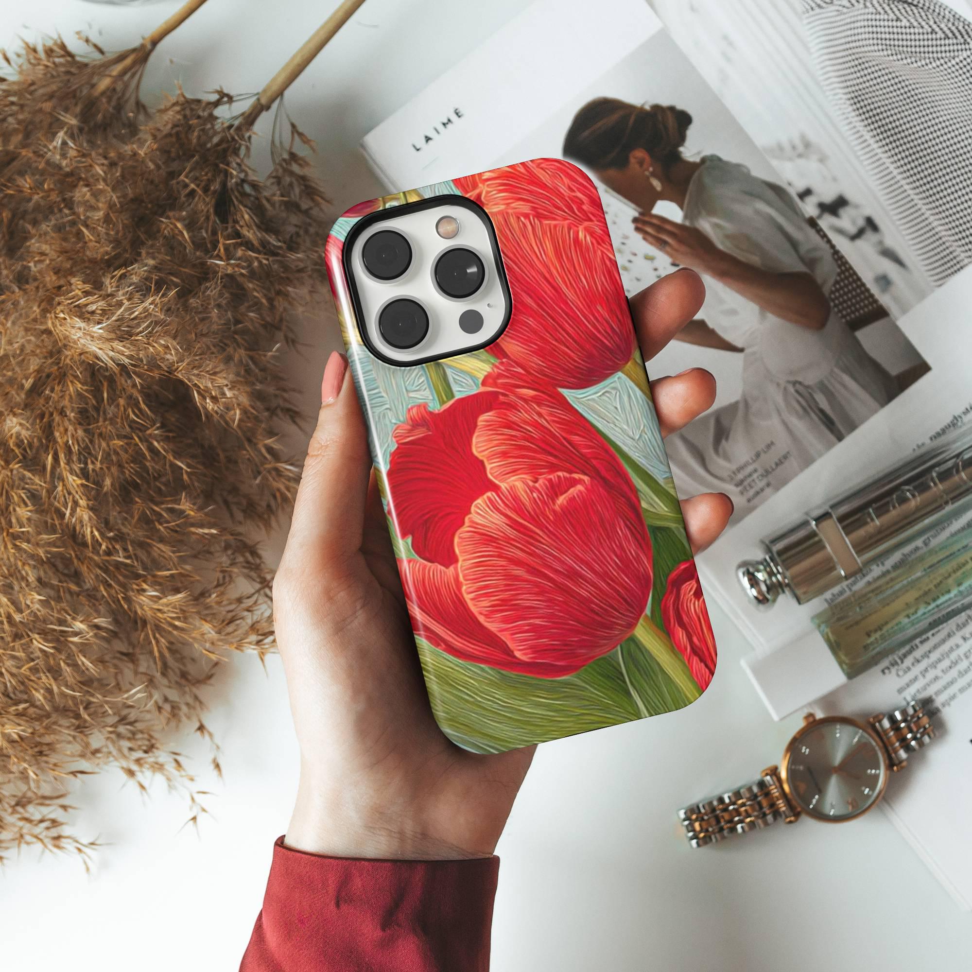 Add a burst of botanical beauty to your iPhone with our RED TULIPS Phone Case featuring a stunning spring floral design. Crafted from premium quality white plastic and a TPU insert for dual protection, this MagSafe-compatible cover ensures your phone stays safe from everyday bumps and drops while exuding elegance and whimsy. Perfectly designed for models like iPhone 16, 15 Pro, 14 Pro Max, 12, and 17 MagSafe, it offers seamless magnetic attachment for quick, secure charging.